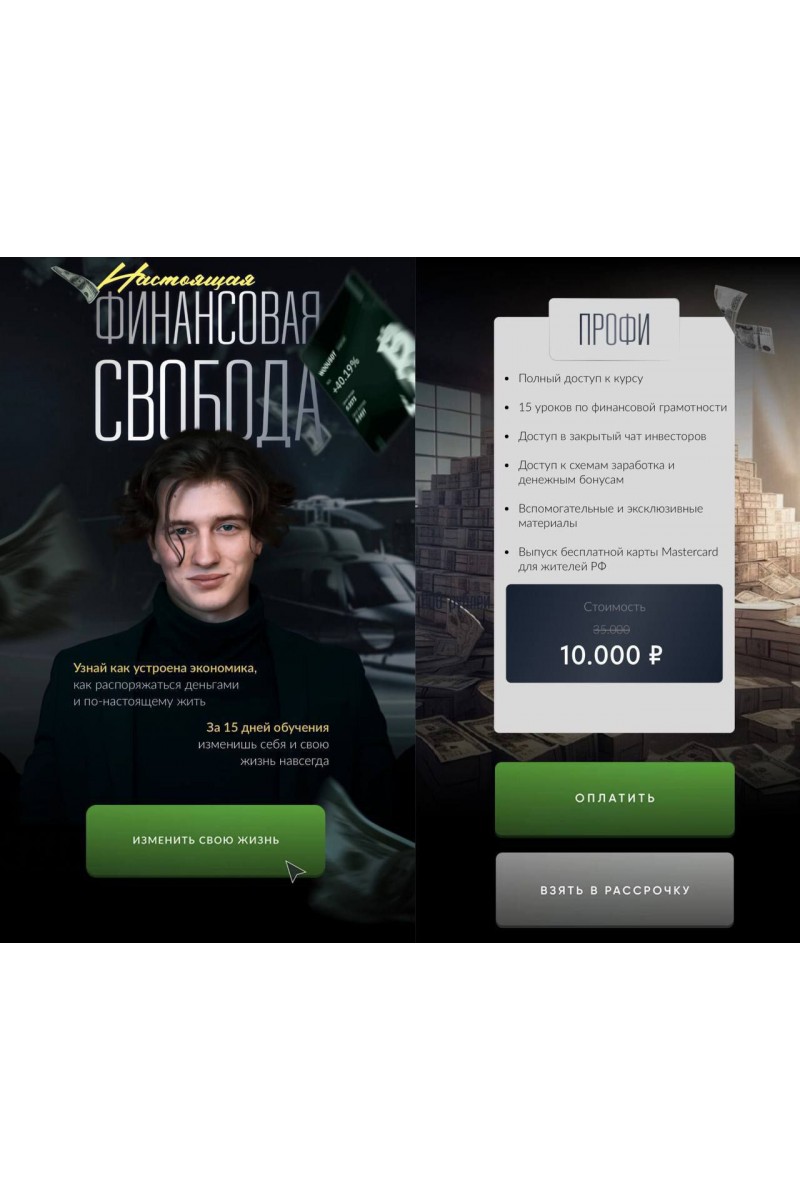 Настоящая финансовая свобода. Тариф ПрофиО чем курс?Ты узнаешь о криптовалюте и научишься ею пользоватьсяПоймёшь, как зарабатывать деньги и как зарабатывать даже на своих тратахЯ сниму тебе розовые очки и ты увидишь, как по настоящему работает экономикаПерестанешь быть зависимым от зарплаты и научишься распределять свои деньги, чтобы они работали на тебяУроки:1 Блок Основы экономики2 Блок Управление средствами3 Блок Пока под санкциямиТариф ПрофиПолный курс15 уроков по финансовой грамотностиВспомогательные и эксклюзивные материалы15 дней обучения