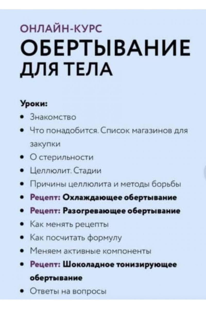 Уроки:ЗнакомствоЧто понадобится. МагазиныО стерильностиВодяная баняЭфирные маслаЦеллюлит. СтадииПричины целлюлита и методы борьбыРецепт: Охлаждающее обертываниеРецепт: Разогревающее обертываниеКак менять рецептыКак посчитать формулуМеняем активные компонентыОтветы на вопросыВ курсе есть информация про все ингредиенты, как менять рецепты, про хранение и применение.ДЛЯ ПРИГОТОВЛЕНИЯ ПОНАДОБИТСЯ:весы ювелирныетермостойкий стакан на 600мл,термостойкий стакан для водяной бани (можно на 250мл)пластиковый стакан ( для измерения сыпучих компонентов)мини-миксерручной блендер с венчикомшпатель для перемешивания и добавления ментоласиликоновая лопаточка ( по желанию, удобно снимать со стенок остатки средства)термометрпипеткабаночки на 200млЧто вы получите?Информацию о натуральных ингредиентах для приготовления.Рецепты для приготовления косметики в домашних условиях.Идеи для собственных оригинальных рецептов.Новые методы борьбы с недостатками кожи.Навыки обертывания тела.