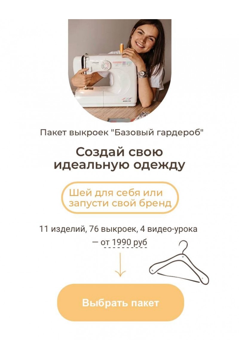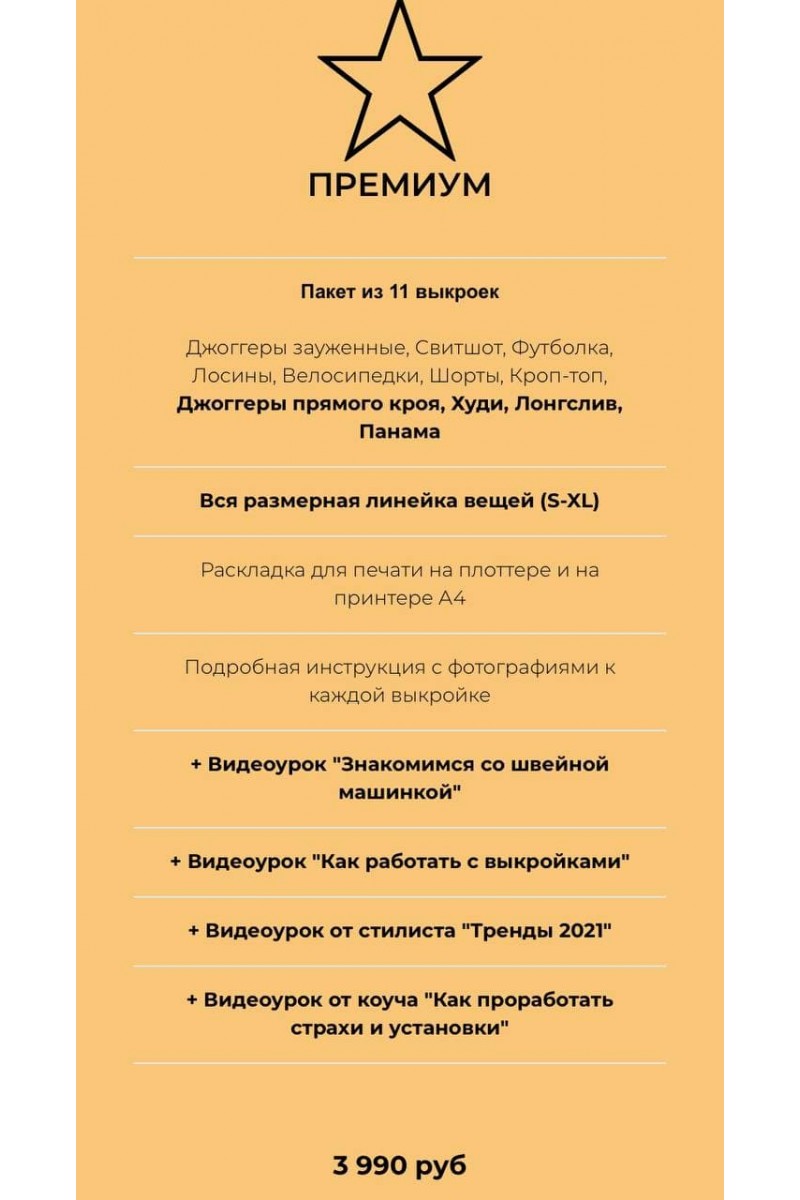 Шей для себя и запусти свой брендВыкройки от Xs до XlПакет из 11 выкроекДжоггеры зауженные, Свитшот, Футболка, Лосины, Велосипедки, Шорты, Кроп-топ, Джоггеры прямого кроя, Худи, Лонгслив, ПанамаВся размерная линейка вещей (S-XL)Раскладка для печати на плоттере и на принтере А4Подробная инструкция с фотографиями к каждой выкройке+ Видеоурок "Знакомимся со швейной машинкой"+ Видеоурок "Как работать с выкройками"+ Видеоурок от стилиста "Тренды 2021"+ Видеоурок от коуча "Как проработать страхи и установки"