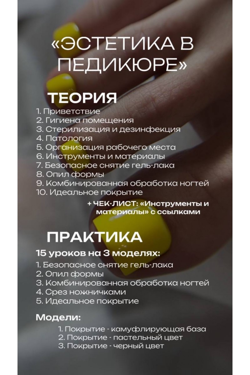 C помощью техники от @spbjulianails ты точно научишься делать чистый педикюр с идеальным покрытием под кутикулуЭта техника позволяет полностью вычистить синусы и создать идеальный бликВ них мы разберемся, как красиво снять педикюр, чтобы он тебя продавал и собирал МИЛЛИОНЫ ПРОСМОТРОВ - Юля знает секреты идеальной съемки, которыми поделится с тобой (ее просмотры в REELS от 100к и тысячи новых целевых подписчиков)Разберем технику того самого сложного дизайна в педикюре - ФРЕНЧ Гарантируем, ты точно сможешь нарисовать его идеально и продавать своим клиентамИ конечно, вишенка Юли на торте - это разбор САМЫХ СЛОЖНЫХ СЛУЧАЕВ В ПЕДИКЮРЕ - влажная и сухая кутикула. В этих дополнительных уроках она покажет тебе, как справляться даже с самыми трудными ногтями, обрабатывать их без ран и порезовТЕОРИЯ:1. гигиена помещения и стерилизация2. патология3. организация рабочего места4. инструменты и материалы5. безопасное снятие гель лака6. опил формы7. комбинированная обработка ногтей8. срез ножничками9. идеальное покрытиечек лист инструменты и материалы со ссылкамиПРАКТИКА:15 уроков на 3 моделях:1. безопасное снятие гель лака2. опил формы3. комбинированная обработка ногтей4. срез ножничками5. идеальное покрытиеМОДЕЛИ:1. покрытие- камуфлирующая база2. покрытие - черный гель лак3. покрытие - пастельный желтый гель лакБОНУСНЫЕ УРОКИ:1. съемка на миллион2. френч в педикюре3. обработка влажной кутикулы4. обработка сухой кутикулы