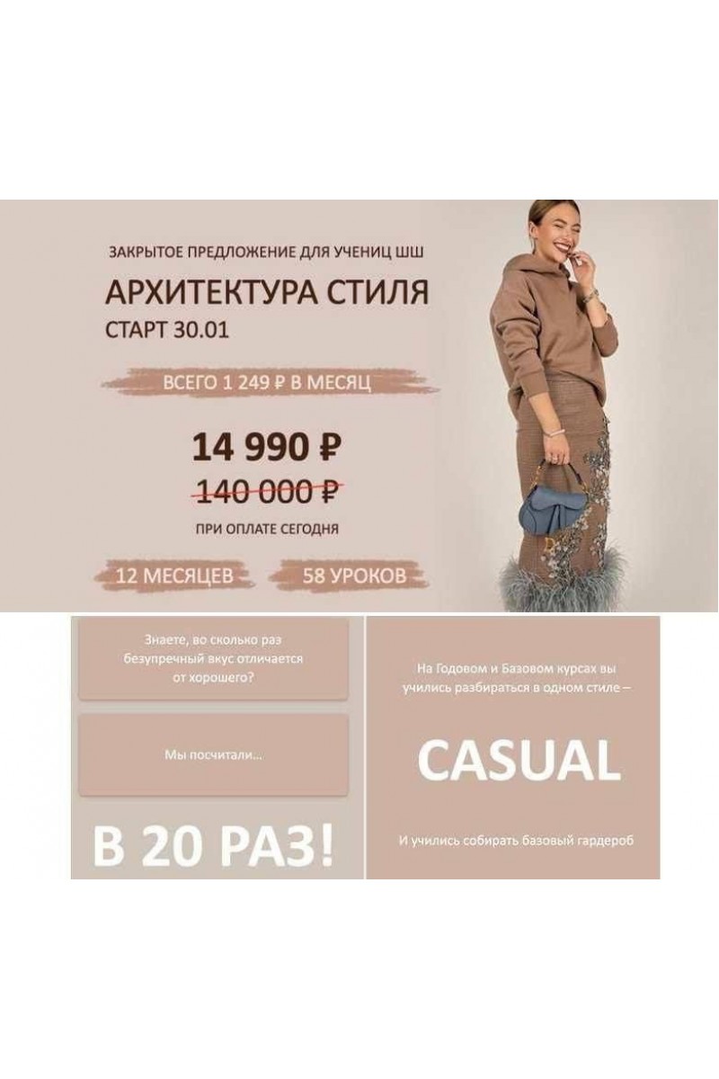 И знаете, что самое интересное?Часть из них можно легко «приготовить» из базовых вещей, зная нужные рецепты. И таким образом повысить возможности своего PervenecPis гардероба в разы, даже не покупая ничего нового, а просто сочетая то, что уже есть, иначе!А также все эти 20 стилей помогают создать свой уникальный стиль и создать неповторимую ДНК гардероба.Вы уже прошли первый уровень хорошего вкуса.Пора довести его до безупречного и научиться сочетать не 1/20 вещей, а все 20/20!Мы будем встречаться 3 раза в месяц:Несколько уроков-инструкций по стилистике, на которых мы по порядку разберем все 20 стилей одежды.Гид по рентабельной моде – новые уроки по стилям, которые разбираем в этом месяце.Шопинг-гид по стилям месяца, чтобы прокачать насмотренность, закрепить знания и проложить новые шопинг-маршруты, доступные только обладательницам PervenecPis безупречного вкуса.Мы будем вышлифовывать ваш вкус и гардероб медленно и с удовольствием в течение года, чтобы прокачать ваших внутренних Эстетов до уровня, доступного единицам.ГОДОВОЙ КУРС 2.0 | СТАРТ В ЯНВАРЕ30.01.2023