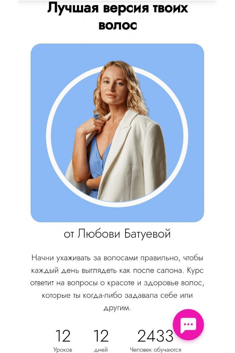 Курс необходим если…Сомневаешься, что правильно подбираешь шампунь и бальзам для своего типа волосНе знаешь, какой уход выбрать в салоне: ботокс, кератиновое выпрямление, «Счастье для волос» или процедуры Olaplex.Боишься навредить волосам химией, которая содержится в уходовых средствахНе знаешь, как ухаживать за своими окрашенными, кудрявыми или пористыми волосамиСомневаешься, к какому специалисту обратиться за решением проблем с волосами или кожей головы: к парикмахеру или к трихологуНе знаешь рабочего алгоритма ухода за волосами, который сделает их красивыми, а кожу головы здоровойИз чего состоит обучение?Курс состоит из 12 уроков, в которых ты получишь ответы на вопросы о здоровье и красоте волос. У тебя останутся опорные материалы и таблицы, которые будут помогать в выборе косметических средств при любом бюджете. Все темы основаны на доказательной научной базе, с минимумом личного опыта, чудес и магии — только наука, изложенная понятным языком.Урок 1Знакомство с автором курса. Строение волоса и типы кожи головыУзнаем, почему повлиять на здоровье и качество уже выросшего волоса — невозможно.Урок 2Правильное мытьё волос. Топ-5 ошибок при уходе за волосамиНаучимся мыть голову правильно. Разберём, может ли навредить волосам полотенце, горячая вода и жёсткая расчёска.Урок 3Myth busters. Что миф, а что правда в информации про уход и волосы?Разберём самые популярные мифы. Узнаем, вредно ли расчёсывать мокрые волосы, повреждает ли их частая сушка феном и обилие укладочных средств? Способствует ли массаж головы росту волос и другие мифы.Урок 4Разбор составов шампуня и ПАВРазберём опорные компоненты при выборе средства для разных типов кожи. На какие дополнительные компоненты обращать внимание?Урок 5Кондиционеры, бальзамы и маски для волос — как выбрать, использовать и в чём отличияУзнаем, чем можно пользоваться каждый день, а чем лишь раз в неделю или две. Что нужно наносить на волосы, а что на кожу головы? И почему это именно так.Урок 6Несмываемые средства для волос — отличия и что искать в составахИзучим такие средства, как мисты-спреи с распылением на сухие или влажные волосы, масла для волос, филлеры для волос, leave-in средства (маски/кондиционеры), увлажняющее/разглаживающее/термозащитное молочко, сыворотка/крем.Урок 7Пилинги для кожи головы и шампуни глубокого очищения — в чём разницаУзнаем, в каких случаях требуется дополнительное очищение кожи и какие средства для этого подходят.Урок 8Особенности ухода за кудрявыми волосами или со сложным окрашиваниемРазберёмся, почему эти типы волос требуют особого ухода и в чём он заключается.Урок 9Микроэлементы для волос и кожиПоймём, как узнать о дефицитах микроэлементов в волосах, как подобрать витамины и восполнить дефициты.Урок 10Контроль здоровья волос — компетенция трихолога или парикмахера?Узнаем о причинах повреждения волос. Как, чем и в каких случаях поможет парикмахер, а в каких только трихолог.Урок 11Салонные процедуры для волос: есть ли эффект?Увидим разницу профессиональной салонной косметики, премиум и масс-маркет. Узнаем, какие салонные процедуры сейчас популярны. Как их проводят и что для этого используют.Урок 12Ежедневная рутина и чекап здоровья волос — итоговая схема.Изучим схему ухода за волосами и будем ухаживать за ними правильно, чтобы волосы сияли здоровьем и красот