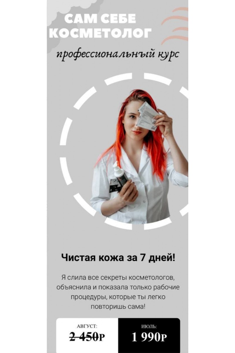 Чистая кожа за 7 дней!Я раскрыла все секреты косметологов, объяснила и показала только рабочие процедуры, которые ты легко повторишь сама!Меня зовут Вика, и чтобы стать косметологом, я очень долго и упорно к этому шла: закончила несколько полноценных курсов, получила диплом, прошла различные семинары по эстетической косметологии, аппаратным методикам ухода за кожей, коррекции возрастных изменений. Теперь я знаю всю кухню косметологии изнутри и научу тебя делать самые эффективные процедуры самостоятельно. Моя цель - сделать профессиональный уход доступным абсолютно каждому!Что тебяждет на курсе?1 Определяем твой тип кожиВыявляем проблемы: акне, расширенные поры, тусклый и неровный тон лица, шелушения, черные точки, мешки под глазами, первые признаки старения, увядающая кожа, потеря упругости, купероз и покраснения и т.д.2 Подбираем эффективные процедурыСоставляем индивидуальный план ухода (подбираем необходимую косметику и профессиональнаые процедуры для домашнего использования)3 Смотрим подробные видео-уроки салонных процедурЯ подробно показываю каждую процедуру от А до Я: где недорого купить всё необходимое; как правильно пользоваться, чтобы был результат; техники и тонкости выполнения.