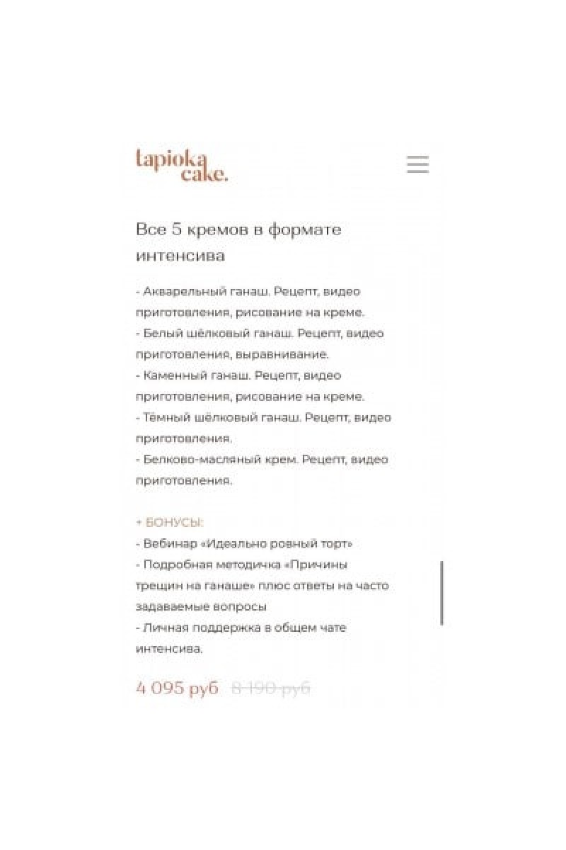 Вы получите: коллекцию авторских идеальных кремов для выравнивания тортов под определённую задачу. Теперь вам не придётся искать в интернете рецепт подходящего крема и прорабатывать, в надежде на хороший результат. Материалы по 5-ти кремам в формате интенсиваАкварельный ганаш. Рецепт, видео приготовления, рисование на креме.Белый шёлковый ганаш. Рецепт, видео приготовления, выравнивание.Каменный ганаш. Рецепт, видео приготовления, рисование на креме.Тёмный шёлковый ганаш. Рецепт, видео приготовления.Белково-масляный крем. Рецепт, видео приготовления.+ Бонусы:Вебинар «Идеально ровный торт» (запись)Подробная методичка «Причины трещин на ганаше» плюс ответы на часто задаваемые вопросы