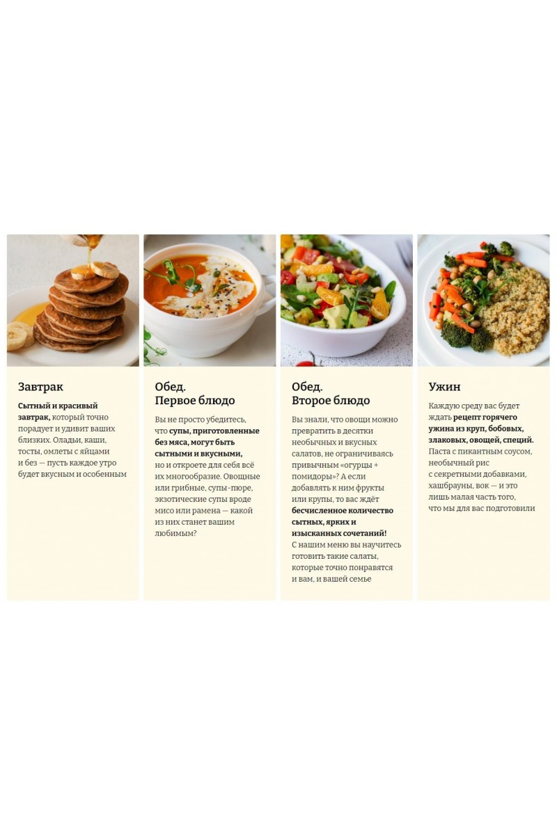 • В каждом письме — меню из 4 блюд: завтрак, 2 блюда для обеда, ужин