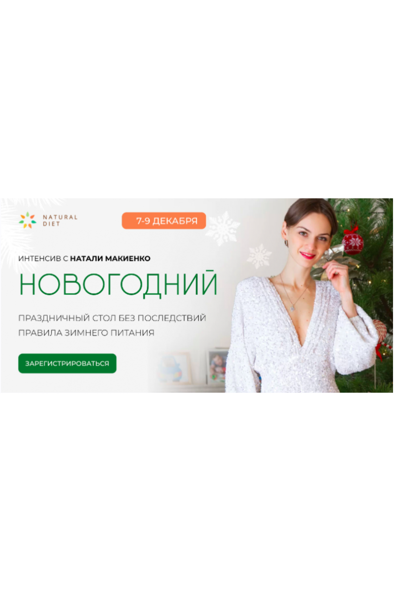 ОВОГОДНИЙ» ПРАЗДНИЧНЫЙ СТОЛ БЕЗ ПОСЛЕДСТВИЙПРАВИЛА ЗИМНЕГО ПИТАНИЯ БЕЗСОЖАЛЕНИЙТариф VIP - все три дня интенсива, включая практику.•Зимние питание и сочетания.Правила зимнего рациона. Какие продукты помогут вам сохранить энергию, здоровье и хорошее настроение в волшебное и суровое время года. Особенности сочетаний зимой. Оптимальный режим питания и дня.•Новогодний стол без последствийНовогодние блюда любимые с детства, наносящие вред нашему организму. Как скорректировать рецепты традиционных блюд и избежать нарушений. Допустимые погрешности. Лайфхаки диетолога и мамы•Составляем меню и планируем after-partyПрактика составления новогоднего меню.Разбор ваших вариантов автором интенсива.3 готовых сета блюд для новогоднего стола от Натали: мясной, рыбный и вегетарианский.Инструкция, как восстановиться после праздников и нарушений