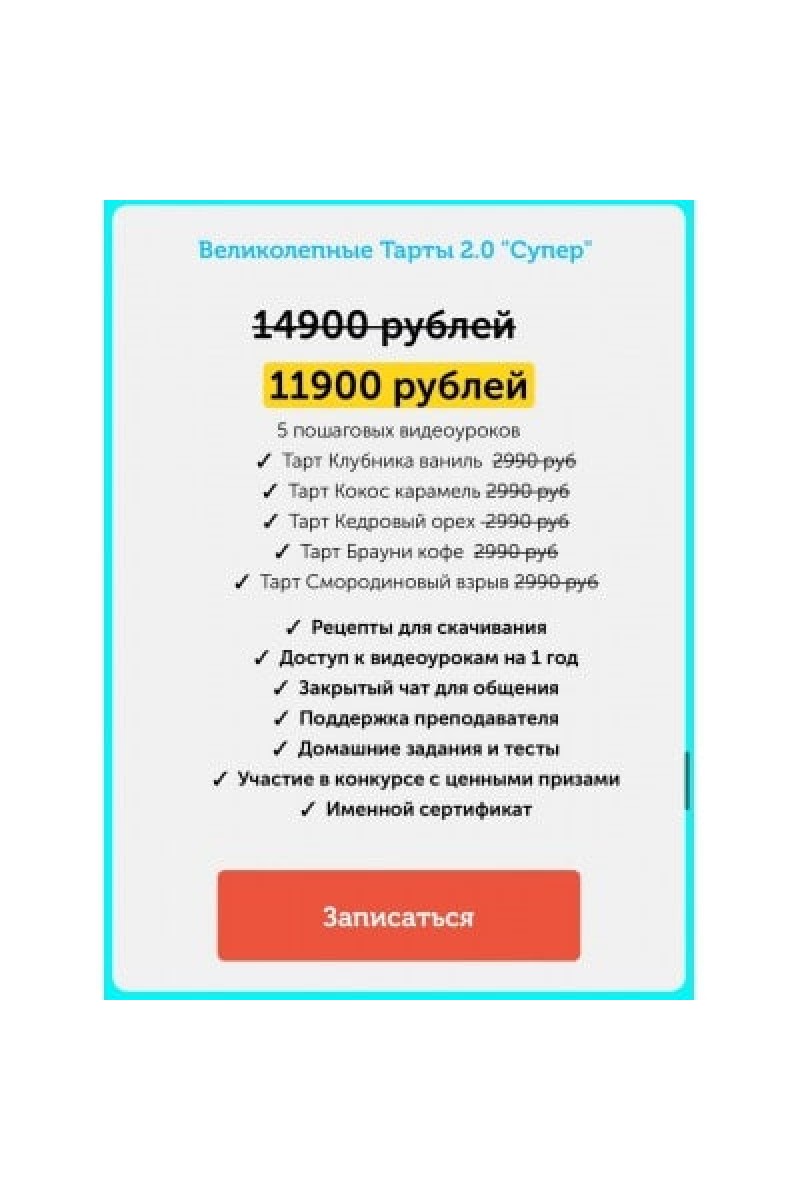 Пошаговые видеоуроки и рецептыТарт Клубника-ВанильМиндальное Сабле, Хрустящий слой, Клубничный соус, Клубничный ганаш, Ванильная намелака, Бисквит без сифона.Тарт Кокос-КарамельКокосовое сабле, Хрустящий слой с миндальными лепестками, Карамелизированные миндальные лепестки, Кокосовая карамель, Кокосовое кремю, Взбитый кокосовый ганаш.Тарт Кедровый орехМиндальное Сабле , Франжипан с кедровым орехом, Карамельная Намелака, Пралине из кедрового ореха, Карамель с Пралине , Взбитый карамельный ганаш.Тарт Брауни-КофеШоколадно-Кофейное сабле, Брауни с грецким орехом, Кофейное кремю.Тарт Смородиновый ВзрывМиндально-Лимонное Сабле, Хрустящий слой с взрывной карамелью, Смородиновый джем, Смородиновый ганаш, Лимонное Кремю, Взбитый смородиновый ганаш .После нашего курса Вы:узнаете все секреты приготовления начинок, декора и покрытиянаучитесь правильно смешивать ингридиенты, выбирать продуктыпроизведете впечатление на Ваших друзей и близких созданными Вами десертамисможете сделать оригинальный подарок на ближайшие праздникисделаете свой ассортимент уникальным