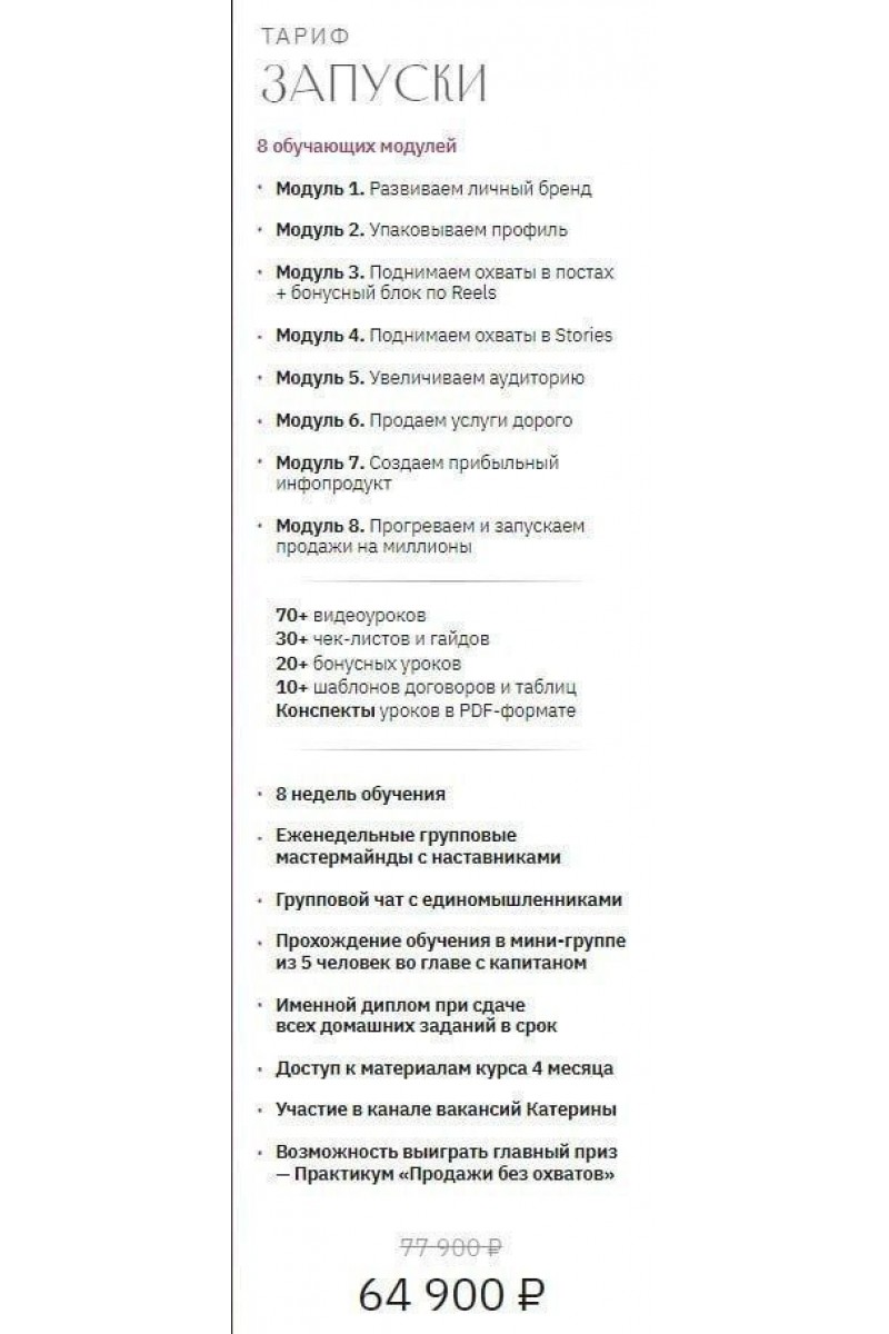 Программа:Модуль 1. Развиваем личный брендМодуль 2. Упаковываем профильМодуль 3. Поднимаем охваты в постах + бонусный блок по ReelsМодуль 4. Поднимаем охваты в StoriesМодуль 5. Увеличиваем аудиториюМодуль 6. Продаем услуги дорогоМодуль 7. Создаем прибыльный инфопродуктМодуль 8. Прогреваем и запускаем продажи на миллионы70+ видеоуроков30+ чек-листов и гайдов20+ бонусных уроков10+ шаблонов договоров и таблиц Конспекты уроков в PDF-формате