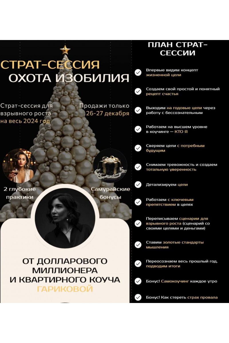 Страт-сессия для взрывного роста на весь 2024 год2 глубокие практикиСамурайские бонусы План Сстрат-сессииВпервые видим концепт жизненной целиСоздаем свой простой и понятный рецепт счастьяВыходим на годовые цели через работу с бессознательнымРаботаем на высшем уровне в коучинге — КТО ЯСверяем цели с потребным будущимСнимаем тревожность и создаем тотальную уверенностьДетализируем целиРаботаем с ключевым препятствием в целяхПереписываем сценарии для взрывного роста (сценарий со своими целями и деньгами)Ставим золотые стандарты мышленияПереосознаем весь прошлый год, подводим итогиБонус! Самокоучинг каждое утроБонус! Как стереть страх провалаФорматПрофессионально записанный урок с полным содержанием страт-сессии, конспектом и рабочей тетрадью