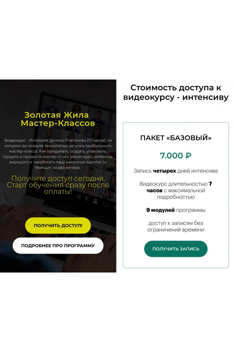 Что особенного в этом интенсиве?Вы попадете на настоящую кухню, где готовится прибыльный мастер-класс.Это не просто теоретические выкладки. Интенси — это концентрат практических рекомендаций с возможностью использовать их прямо в ходе прохождения.Благодаря этому вы не уйдете с интенсива "с пустом". Вас ждет план действий, а на выходе — готовые основные моменты для запуска своего мастер-класса.На интенсиве я так же покажу важные технические моменты для организатора платного мастер-класса:- варианты приема денег за МК, кроме перевода на карту,- инструменты для профессионального онлайн-проведения мастер-класса,- сервисы для профессиональной упаковки мастер-классаЧто вы получите на интенсиве?Методику выбора денежной темы для мастер-классаФорматы и виды мастер-классов, которые продаются в ВК "на ура"Принципы продающей упаковки МКСтруктуру мастер- класса, которая будет притягивать ваших клиентов на этапе продажиПринципы ценообразования для продажи МК и способы увеличения ценностиСпособы продажи мастер-классов, методики увеличения дохода от создания мастер-классаПрограмма интенсива "Золотая Жила Мастер-Классов"Модуль 1.Зачем нужны и почему важны мастер-классыМесто мастер-класса (интенсива, воркшопа) в линейке продуктовПринцип заработка на мастер-классахНеобходимые условия для стабильного заработка на МКПринцип "Продажи по базе"Форматы мастер-классов. Подберите себе подходящий форматДенежный план на мастер-классМодуль 2.Как выбрать тему для мастер-классаКак найти денежную тему для мастер-классаКак терапевту "вытащить" тему для мастер-класса, если вы никогда этого не делалиКак выбрать тему, среди тех, которые у вас естьКак протестировать гипотезу выбранной темыРабота над поиском идеи для МКМодуль 3.Как придумать продающее название для МККак придумать продающее названиеПримеры продающих названийКонструктор продающих названийТехника "Бродвей" для упрощения проведения мастер-классовРабота над созданием названия для своего МКМодуль 4.Как создать структурный план мастер-классаНеобходимые элементы структуры мастер-класса для успешной продажиПринципы создания продающей структурыРабота над созданием примера продающей структурыМодуль 5.Какие цены ставить на мастер-классыКак разработать свою ценовую политикуС какой цены начинатьКак увеличивать цены на мастер-классПринципы дедлайнов и роста ценыРабота над собственной ценовой политикойМодуль 6.Как увеличить ценность мастер-класса для увеличения продажПринципы наполнения пакетов для продажи МКДополнения, который приносят деньгиКак обещать результат на МК, который идет всего один вечерРабота по созданию дополнительной ценностиМодуль 7.Как упаковать (оформить) мастер-класс, чтобы он привлекал платежеспособную аудиториюКак упаковать личную страницу под мастер-классКак упаковать группу эксперта под мастер-классПлан статьи-сайта ВКонтакте для упаковки МКПримеры упаковки в формате сайтовРабота по созданию продающей упаковкиМодуль 8.Как объявить о мастер-классе — оффер на МКПринцип "Оффер в лоб"Структура поста-презентацииГде и кому показывать оффер на мастер-классКому и как рекламировать постВариант использования бота Сенлер в презентации оффераМодуль 9.Как продавать мастер-класс по базе и в постахПодготовка базы для продажи мастер-классаМаркетинговый ту