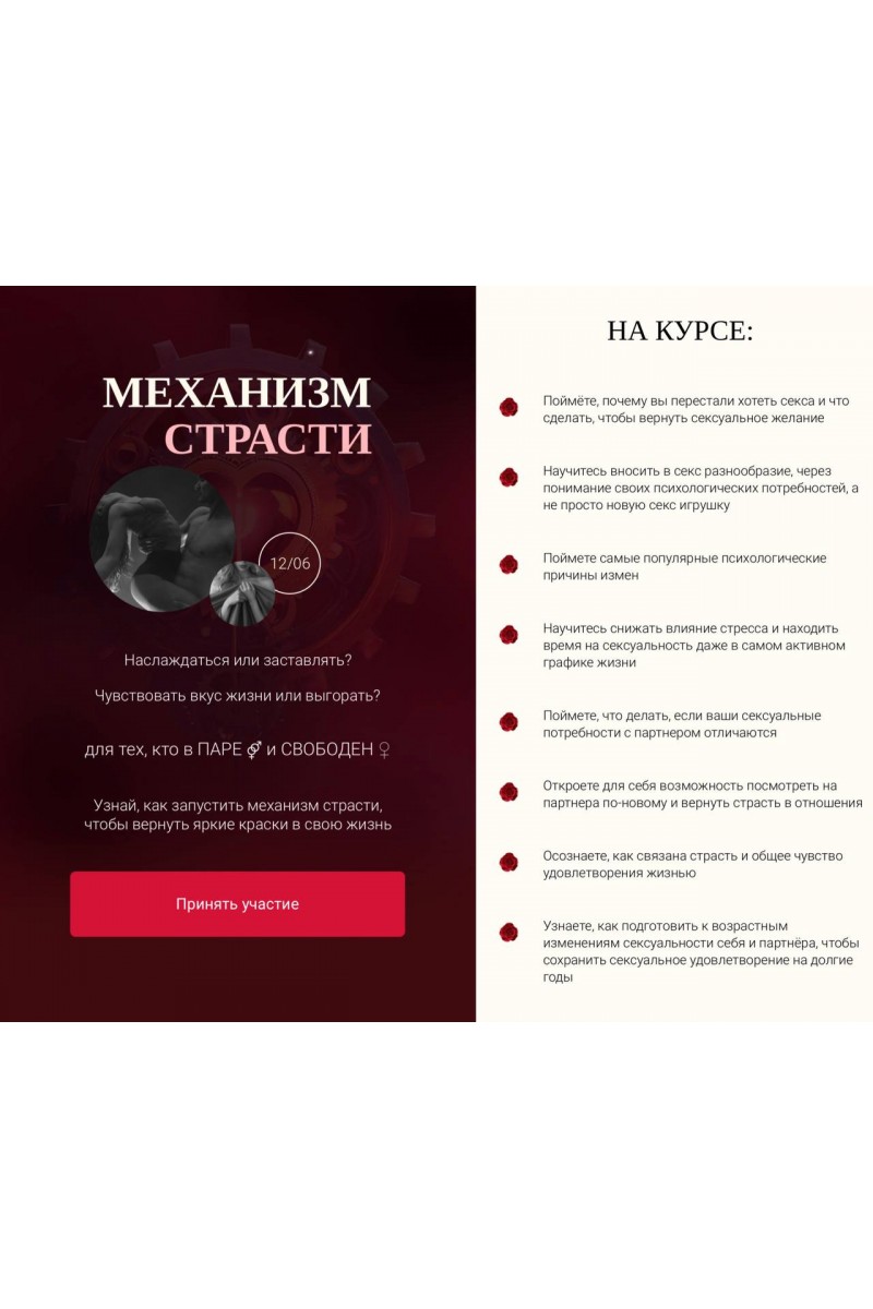 Проблемы, на которые приходится честно смотреть:- Мне надоело терпеть и заставлять себя заниматься сексом. У меня нет желания.- Однообразие и рутина, наш секс стал предсказуемым и скучным. Мне не хватает ярких эмоций, страсти.- Другие партнеры кажутся более привлекательными, в то время, как свой партнер привычный и рутинный.- Думаю о флирте на стороне или даже измене.- С рождением ребёнка желание снизилось, секс почти исчез, но я не понимаю, как выйти из роли мамы.- Сегодня хочет он, а я не хочу, потом наоборот. Наши сексуальные ритмы не совпадают, но подстраиваюсь только я. Надоело- Хочу быть в отношениях, но я устала искать партнёра. Попала в замкнутый круг.- Заставляю себя быть лучшей версией во всём, сравниваю себя. Я часто недовольна собой.- Меня перестала вдохновлять жизнь/партнёр/работа. Ушли яркие эмоции и счастьеВСЕГО ОДНА НЕДЕЛЯ, ЧТОБЫ:- НАУЧИТЬСЯ ВЫХОДИТЬ ИЗ СТРЕССА,- ВОЗВРАЩАТЬ СЕКСУАЛЬНОЕ ЖЕЛАНИЕ,- ВНОСИТЬ РАЗНООБРАЗИЕ В ПАРТНЕРСКИЙ СЕКС- РАЗОБРАТЬСЯ С МЕХАНИЗМОМ ЛЮБВИ И СТРАСТИ!ПРОГРАММАИСТИННЫЕ ЖЕЛАНИЯ1. Либидо.2. Сексуальное желание.3. 30 факторов, подавляющих сексуальное желание, с которыми мы можем столкнуться в обычной жизни.4. Стратегии по корректировке вашего сексуального желания.5. Стресс, как главный враг сексуального желания. Причины стресса, как избежать хронического стресса.6. Завершение цикла стресса через тело.7. Объективная оценка собственных целей.8. Время. Выход из цейтнота, выделение времени для отдыха, сексуальности и удовольствия.ЛЮБОВЬ И СТРАСТЬ1. Современные концепции любви. Что такое любовь?2. Бессознательный выбор партнера. Ваши личные триггеры.3. Взаимосвязь страсти и любви.4. Механизм страсти - что в нас рожает страсть.5. Сексуальная скука. Почему секс становится рутиной в гармоничных отношениях.6. Как поддерживать страсть в длительных отношениях и снова начать хотеть своего партнера.7. Существующие форматы отношений. Выберите, что подходит вам.8. Измены, как попытка удовлетворения потребностей на стороне.СЕКС НА САМОМ ДЕЛЕ1. Что такое секс на самом деле?2. Осознание психологических потребностей, которые мы хотим удовлетворить через секс.3. Расширение понятия секс, выход за рамки генитального контакта.4. Сексуальное разнообразие. Инициатива в сексе.5. Сексуальный эгоизм и создание "интимной команды" в паре.6. Влияние возраста на сексуальность. Онтогенез сексуальности.7. Определение потребностей текущего возрастного этапа развития сексуальности.8. Гармонизации секса при разной частоте сексуального желания партнеров.ОБ АВТОРЕКатрин РоузСексолог-Психолог- Член Всемирной Ассоциации Сексуального Здоровья;- Бессрочный Член Ассоциации РНСО;- Член Профессионального Сексологического Объединения;- Презентующий автор на 25 Всемирном Конгрессе по Сексуальному здоровью, Кейптаун, ЮАР, 2021г. «Инстаграм тренинг, как метод корректировки коитальной аноргазмии в России;- Презентующий автор на 24 Всемирном Конгрессе по Сексуальному Здоровью, Мехико, Мексика, 2019год;- Участница 23 Всемирного Конгресса по Сексуальному здоровью, Прага, Чехия, 2017г.- Участница I научно-практической конференции «Сексология и психотерапия XXI века. Запад и Восток - мосты дружбы и сотрудничества», Нарва, Эстония, 2019год. и многих других.- Автор научных образовательных программ и тренингов.