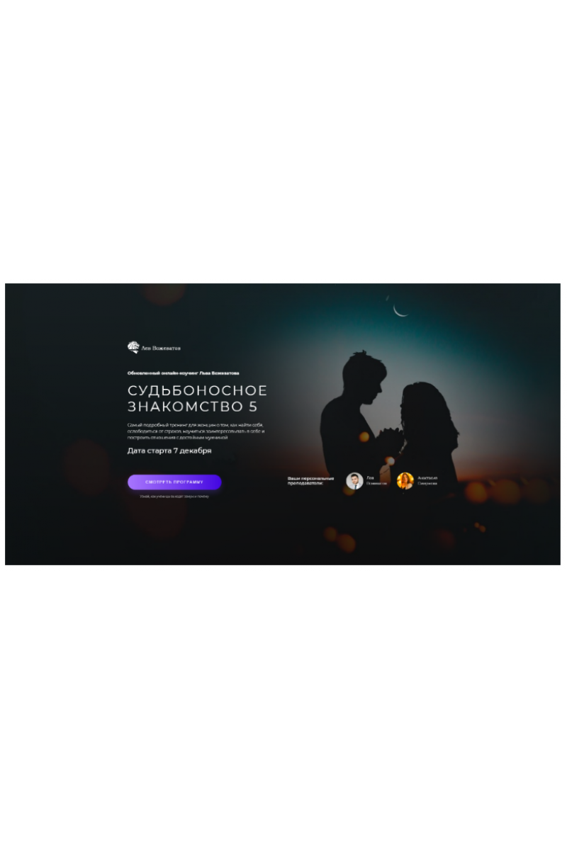 Лев Вожеватов - Судьбоносное знакомство 5.0КоролеваДля тех, кто хочет создать очередь из желающих познакомиться и построить серьезные отношенияВключены уроки «Принцессы»+ уроки:Женские глюки, которые мешают быть счастливой и найти мужчинуЖенское состояние. Как быть легкой, счастливой и радостнойАрхетипы привлекательности. Как быть привлекательной женщиной изнутри, чтобы любили за внутренний мирФлирт для создания отношенийПервый секс. Когда должен быть и как вести в постели себя дальшеКак знакомиться в интернетеПервое свидание. Как провести свидание, чтобы он захотел второеВнешний видРезультат:Сможете привлечь и очаровать достойного мужчину, с которым построите долгие отношенияМодуль 1 "Принцесса":Если ты готова, смотри, какие этапы нам предстоит пройти:Урок 1Цели женщины в отношениях – чего я хочу и что нужно на самом деле женщинеКаждая женщина вступает в отношения с определенной целью. Она хочет решить свои задачи за счет отношений с мужчиной. Но не все цели, и не все пути достижения этих целей, ведут к успеху. Когда женщина ставит неправильную цель, или выбирает неправильный путь достижения этой цели, как итог она получает неудачные отношения.После урока вы поймете, какая цель у вас в отношениях и как ее лучше достигать.В этом уроке вы узнаете:9 целей которые женщины хотят достигнуть в отношенияхКакие личные цели не достигаются в отношениях.Как разобраться в себе. Как понять, чего вы хотите от отношений.Причина – почему большинство отношений изначально обречены на провал. Хотят одно, а нужно другое.Способы достижения личной цели в отношенияхГлавный результат:Разберетесь какая цель у вас в отношениях и как ее лучше достигать
