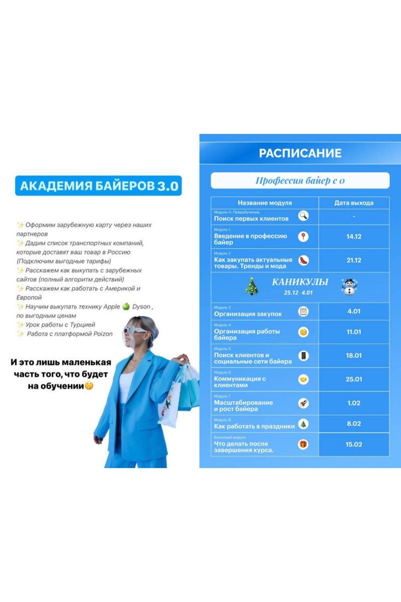Модуль 0. ПредобучениеМодуль 1. Введение в профессию байерМодуль 2. Как закупать актуальные товары. Тренды и модаМодуль 3. Организация закупокМодуль 4. Организация работы байераМодуль 5. Поиск клиентов и социальные сети байераМодуль 6. Коммуникация с клиентамиМодуль 7. Масштабирование и рост байераМодуль 8. Как работать в праздникиБонусный модуль. Что делать после завершения курса?