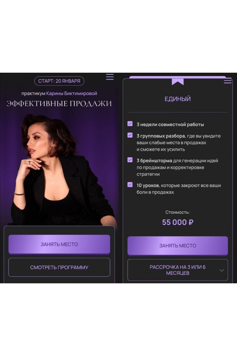 Предобучение. Организационные моменты.• Знакомство в чате практикума.• План обучения. Как будет проходить практикум? Как распределена нагрузка? Трекер успеваемости.Как начать продавать?• Эмоции в продажах. Что мешает вам продавать?• Система продаж. Как превратить хаос в структуру?• Ваши суперсилы в продажах. Как продавать?• Клиентская база. Где брать новых клиентов и как работать с текущими?• Разборы продаж с Кариной Биктимировой.Как продавать свои услуги дорого?• Ценообразование. Как устанавливать цены на услуги с личным участием и без вашего участия?• Донесение ценности. Как сформировать потребность в покупке?• Скидки, акции, распродажи. Как работать с высокой ценой?• Разборы продаж с Кариной Биктимировой.Как выстраивать продажи, чтобы покупали?• Продажи на созвонах. Как продавать без «но»?• Продажи в переписках. Как поднимать вашу ценность и экономить ваше время, зарабатывая?• Продающий прогрев. Как продавать, не продавая?• Разборы продаж с Кариной Биктимировой.