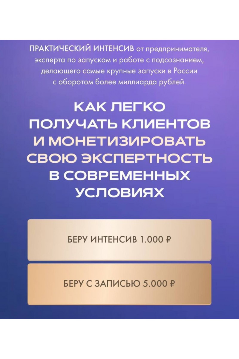 День 1Работающая система постоянных клиентов и денег в кассеМОНЕТИЗИРУЙ СВОИ СТРАХИ И СВОЮ ИСТОРИЮ ЖИЗНИ НА МИЛЛИОНЫ.РАСПАКУЙ СЕБЯ И СОЗДАЙ СВОЮ ИСТОРИЮ НА МИЛЛИОНЫ.День 2Как выбрать самую востребованную идеи и нишу и упаковать для актуального периода продуктКАК ВИДЕТЬ ТРЕНДЫ БУДУЩЕГО, СОЗДАВАТЬ СВОИ ПРОДУКТЫ И УСЛУГИ РАНЬШЕ ВСЕГО РЫНКА.ГДЕ БРАТЬ ИДЕИ.КАК МОНЕТИЗИРОВАТЬ СВОИ ИДЕИ.КАК ВЫБРАТЬ САМУЮ ВОСТРЕБОВАННУЮ ИДЕЮ, КОГДА У ТЕБЯ ИХ МНОГО.День 3Как сделать так, чтоб клиент хотел купить именно твой продукт или услугуКАК УЗНАТЬ, ЧЕГО ХОЧЕТ КЛИЕНТ.КАК СОВМЕСТИТЬ СВОЙ ПРОДУКТ С ПОТРЕБНОСТЯМИ КЛИЕНТА.День 4Как начать продавать и продавать дорого. Как узнать сколько стоит твой продукт или услуга на самом делеДень 5Разборы