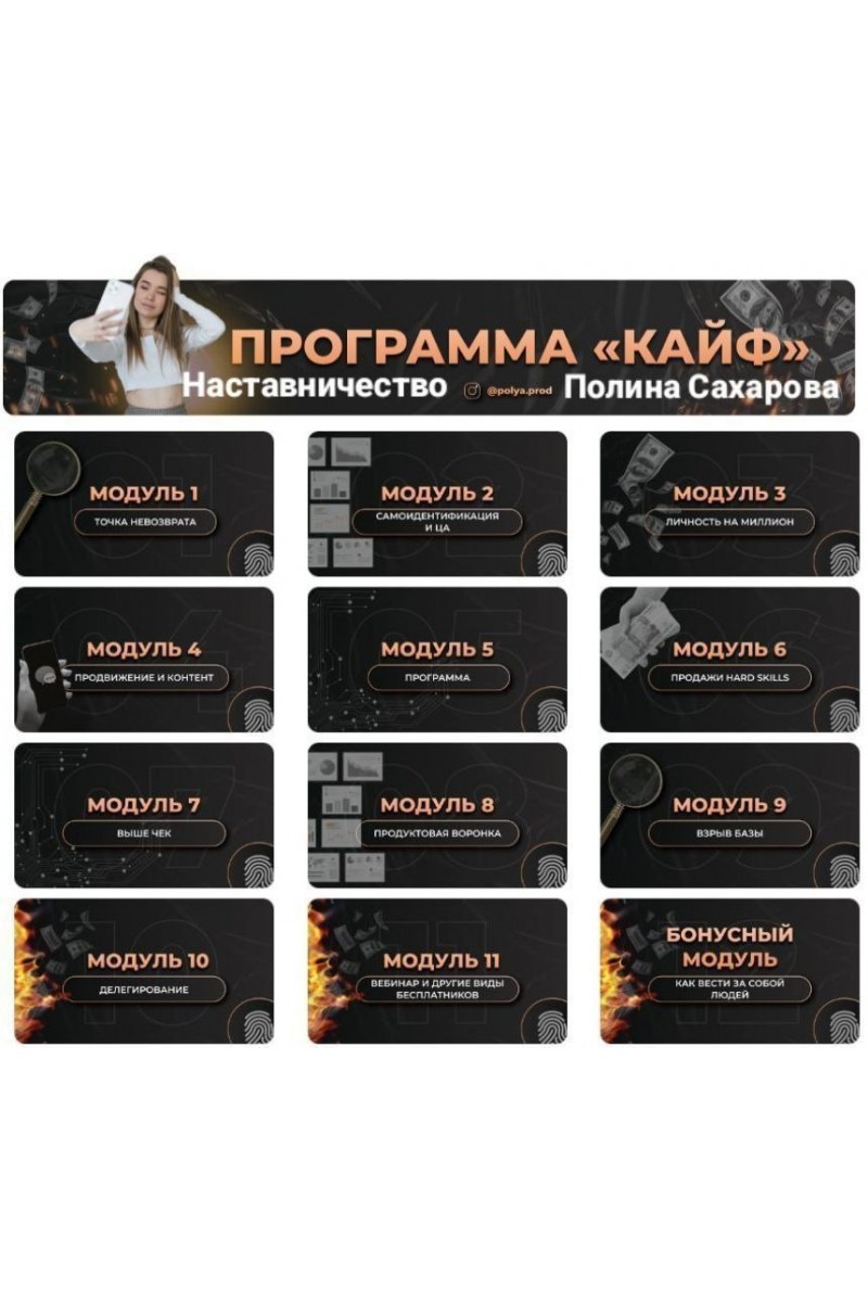 Модуль 1 «Точка невозврата»Модуль 2 «Самоидентификация ЦА»Модуль 3 «Личность на миллион»Модуль 4 «Продвижение»Модуль 5 «Программа»Модуль 6 «Продажи Hard skills»Модуль 7 «Выше чек»Модуль 8 «Продуктовая воронка»Модуль 9 «Взрыв базы»Модуль 10 «Делегирование»Модуль 11 «Вебинар и другие виды бесплатников»Модуль 12 «Как вести за собой людей»