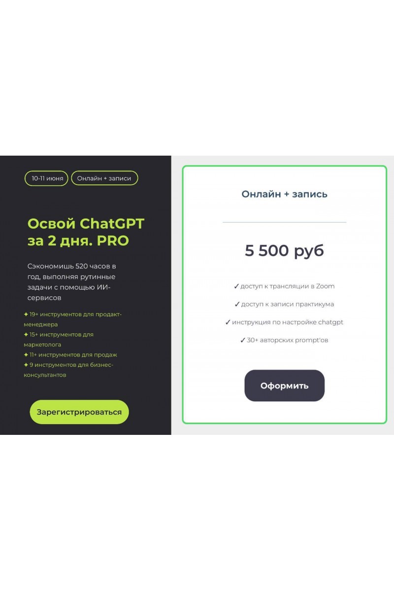 Сэкономишь 520 часов в год, выполняя рутинные задачи с помощью ИИ-сервисов✦ 19+ инструментов для продакт-менеджера✦ 15+ инструментов для маркетолога✦ 11+ инструментов для продаж✦ 9 инструментов для бизнес-консультантовВ результате за 2 дня ты научишься:Строить диалог с ChatGPT, чтобы получить от него пользуОбучать ИИ под себя и свой бизнес, обогащая контекстПридумывать офферы в зависимости от каналаСоздавать лендинги и презентацииПроводить ABCD-сегментациюСоставлять скрипты продажРазрабатывать воронки продажФормулировать профили вакансийСоставлять анкеты/тесты для кандидатовАнализировать резюме соискателейСчитать юнит-экономикуФормировать бизнес-модельСоставлять ТЗ или бриф на разработкуПисать простой кодПереводить аудио в текст и анализироватьСоздавать видеоролики с помощью ИИ без специальных знаний