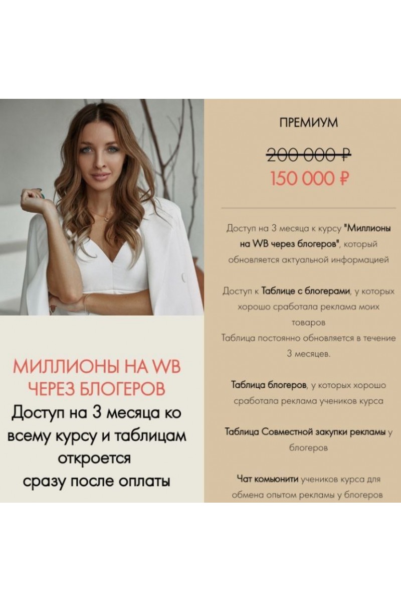 База знаний Закулисье «Миллионы на WB»:Постановка цели в чистой прибыли. Стратегия действий.Регистрация ИПОткрытие расчетного счетаРегистрация на WBАнализ ниш и выбор высокоприбыльных товаров. Анализ конкурентовПривлечение финансов. Наиболее выгодные и легкие способы привлечения финансов именно для маркетплейсовНайм ассистента. Шаблон вакансии. Где и как найти идеального. Прилагаются договоры, которые необходимо заключить.Закуп товара. Где и как. Производство или закуп?Сертификация товара. Проверенный контакт.Маркировка товаров.Фулфилменты. Контакты проверенных.Фотосессия и видео, которые увеличат ваши продажи в разы. Контакты.Инфографика. Контакт классного дизайнера.Упаковка. Контакты, где быстро, качественно и дешевле.Поиск высокочастотных ключевых словГрамотное создание карточки товара, которая даст вам отличные продажи. Лайфхаки.SEO продвижение. Как увеличить свои продажи в несколько раз.Формирование поставки.Отгрузка на склад WB.Стратегия самовыкупов.Самовыкупы. Таблица. Программа для легких самовыкупов.Секретный способ самовыкуповСамоотзывыРабота с отзывами. Как даже из негативных отзывов взять пользу и направить на увеличение продаж.Заказ эффективной рекламы у блогеров. Лайфхаки работы с блогерами, с помощью которых вы повысите продажи у них.Таблица блогеров, которые хорошо сработали у насЗапуск эффективного таргета. Как создавать креативы, дающие дешевый клик.Заполнение ДДС, ПНЛ. Самые необходимые таблицы.Анализ вышедшей рекламы у блогеров. Работа в долгосрок.Как эффективно развивать бизнес на WB в новых реалиях - постоянно обновляющийся модуль.Эффективная внутренняя реклама, лайфхак, приносящий сотни заказов за минимальную цену.База будет обновляться актуальной информацией по мере изменений на рынке WB.