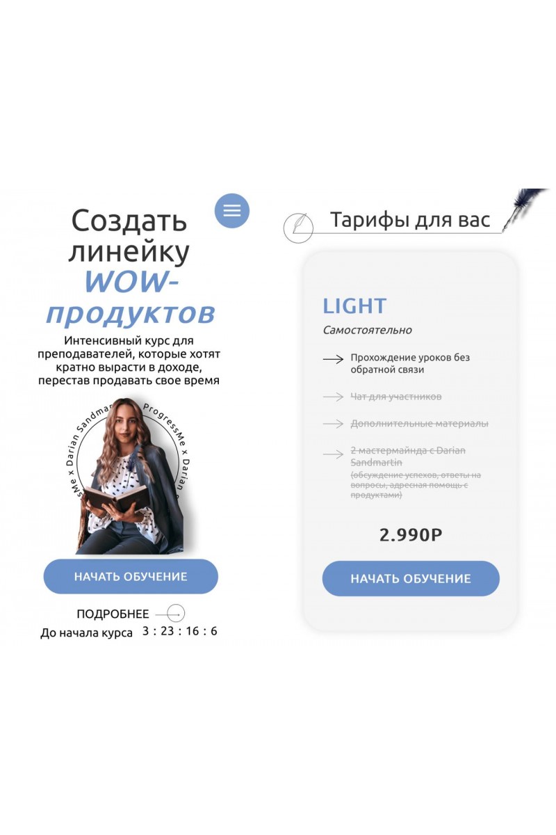 Интенсивный курс для преподавателей, которые хотят кратно вырасти в доходе, перестав продавать свое времяРегистрируйтесь, если вы хотитесоздать целую линейку крутых продуктов: марафоны, курсы, чаты, вебинары, воркбукиуйти от почасовой оплаты и постоянного поиска учениковобучать сотни студентов и учениковпонять, как успешно и безопасно работать на себявыяснить, как кратно увеличить доходы без продажи собственного времениузнать, что отличает успешные образовательные продукты от посредственныхЧто вы получите на курсе?Узнаете все тонкости создания образовательных продуктов любого содержанияНайдете аудиторию, которая будет ценить и ждать ваши курсы и марафоныНайдете "свой" продукт, который будет востребованПерестанете зависеть от стоимости часа и количества уроковЧто вы получите на курсе?Получите пошаговую стратегию создания успешного образовательного продуктаМотивацию для совершения первых шагов в создании своего продукта или его доработки