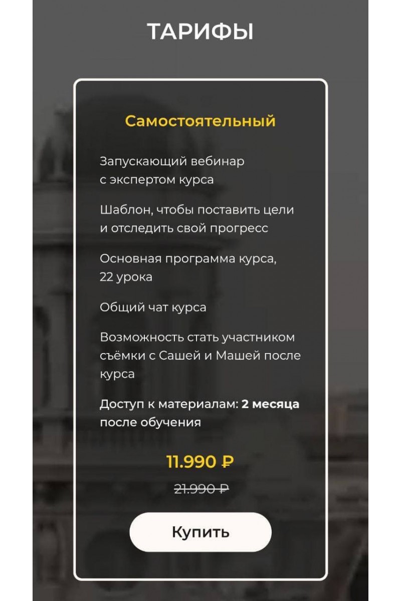 Курс по созданию видеоконтента для Instagram и других площадокОсвойте навыки видеопродакшена и начните зарабатывать на контентеО ЧЕМ ЭТОТ КУРС?Охваты наших видеопостовВлюблять и вовлекать аудиторию, создавать образ бренда в онлайне или вызывать желание купить — всё это достигается благодаря качественному видеоконтентуСотни и тысячи брендов, блогеров и экспертов борютсяза внимание аудитории на разных площадках каждый день, и выиграет тот, кто предложит более интересный аудитории контент. Именно вы можете научиться создавать его.Мы передадим вам весь опыт и все секреты создания запоминающегося видеоконтента, снятого и смонтированного на режиссерском уровне.Тариф: СамостоятельныйЗапускающий вебинар с экспертом курсаШаблон, чтобы поставить цели и отследить свой прогрессОсновная программа курса, 22 урокаОбщий чат курсаВозможность стать участником съёмки с Сашей и Машей после курса