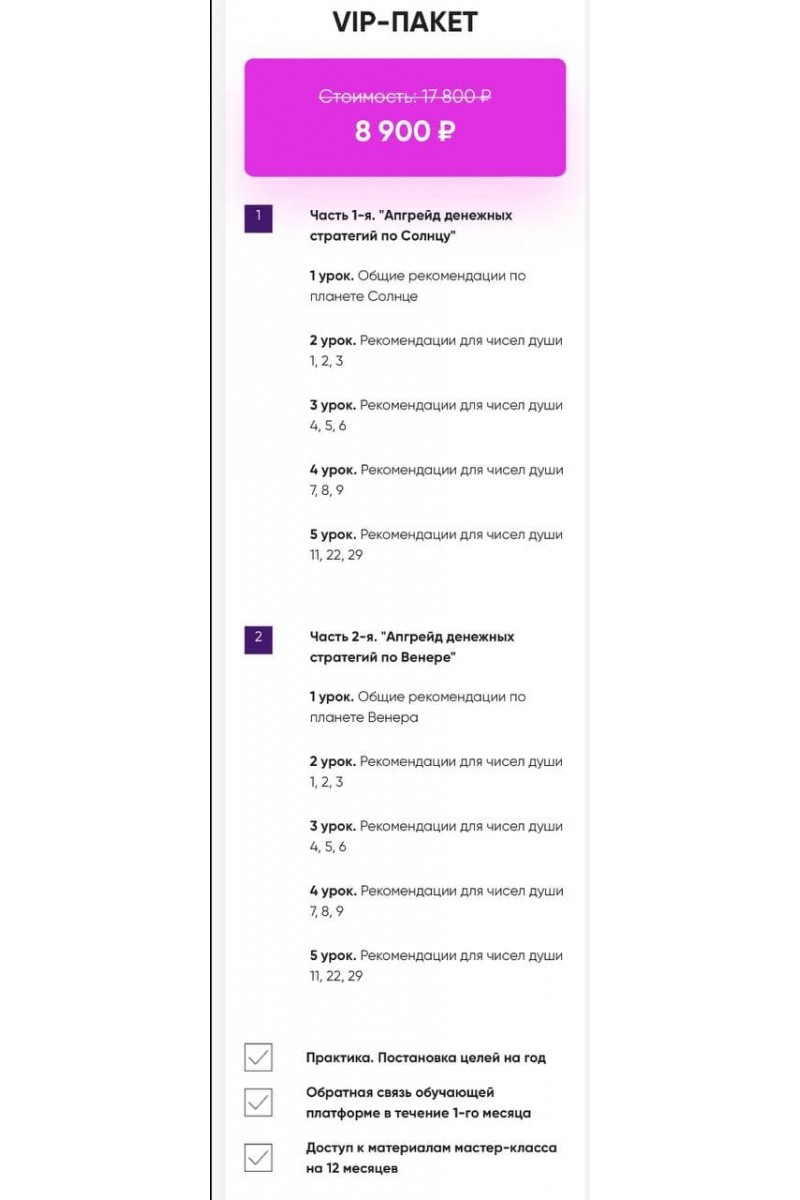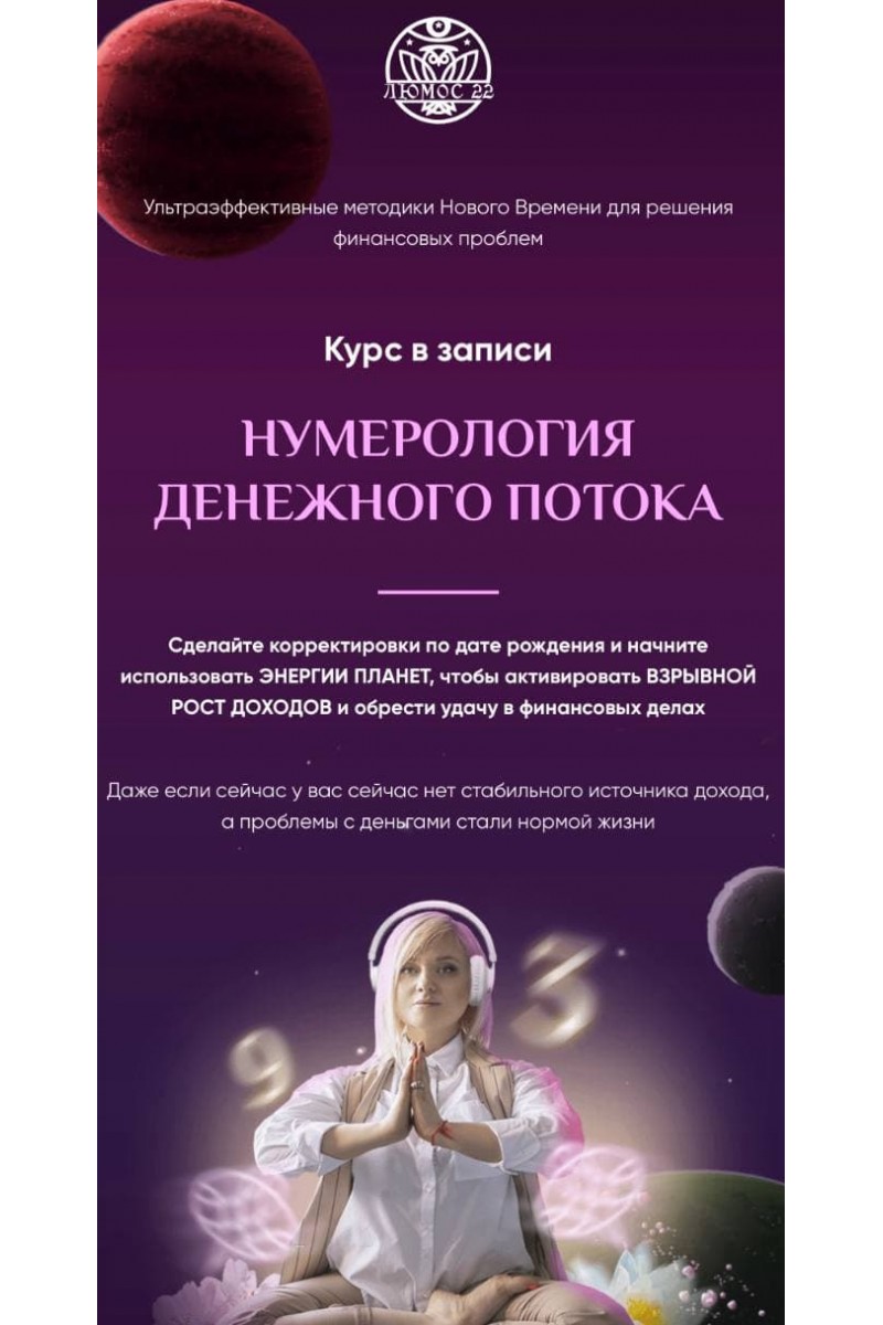 Сделайте корректировки по дате рождения и начните использовать ЭНЕРГИИ ПЛАНЕТ, чтобы активировать ВЗРЫВНОЙ РОСТ ДОХОДОВ и обрести удачу в финансовых делахДаже если сейчас у вас сейчас нет стабильного источника дохода, а проблемы с деньгами стали нормой жизниЧТО ТОРМОЗИТ ВАШ ДЕНЕЖНЫЙ ПОТОКВаши финансовые результаты — это следствие принятых решений.Эти решения вы принимаете ежедневно. Как и все. Только кому-то они позволяют получать больше денег, чем вам.Выбор решений зависит от образа мыслей.Как человек мыслит, такие решения он и принимает. Если кролик сидит в одной клетке с волком, он думает, как бы тот его не съел. А волк думает, как бы съесть кролика. Образ мыслей разный и действия будут разные. Поняли смысл?А вот образ мыслей зависит уже от наших знаний, навыков и от влияния планет.КАК НУМЕРОЛОГИЯ ПОМОЖЕТ ВАМ ПРИВЛЕКАТЬ БОЛЬШЕ ДЕНЕГСвязь цифр с планетами и их влияние на нашу жизнь доказаны тысячи лет назад.У каждого человека есть свой Персональный нумерологический код, который зашифрован в дате рождения, где любое число соответствует определённой планете.Нумерология расшифровывает этот код, показывает, как на вас влияет энергия планет и учит, как с помощью этих данных, можно корректировать свою судьбу, открывая путь к изобилию и достатку.ЗА СЧЁТ ЧЕГО ВЫ ДОБЬЁТЕСЬ ВЗРЫВНОГО РОСТА ФИНАНСОВВ нашей дате рождения содержится личный финансовый код и сильные вибрации наших "денежных" планет: Солнца и Венеры.Если вас преследуют финансовые неудачи, долги и безденежье, возможно, ваши "денежные" планеты "спят".Суть курса "Нумерология денежного потока" в том, чтобы усилить влияние этих планет на финансовую сферу. В этом нет никакого чуда — есть только расчеты и правильный алгоритм действий.Программа курса:ЧАСТЬ 1-яАПГРЕЙД ДЕНЕЖНЫХ СТРАТЕГИЙ ПО СОЛНЦУКак соединить ключи Денежной Астрологии и Денежной нумерологии?Новые привычки, зажигающие ваше внутреннее денежное СолнцеПостановка главных денежных целей на годСтратегии на пути к мужским финансовым ресурсамЧАСТЬ 2-яАПГРЕЙД ДЕНЕЖНЫХ СТРАТЕГИЙ ПО ВЕНЕРЕКак попасть через Венеру Ва-банк без проигрыша?Новые привычки, зажигающие вашу внутреннюю денежную Венеру9 способов по планетам, как достичь финансовой свободыКак прокачать 2 денежных канала?Как прокачать в себе 3 важных мотива поведения?1Часть 1-я. "Апгрейд денежных стратегий по Солнцу"1 урок. Общие рекомендации по планете Солнце2 урок. Рекомендации для чисел души 1, 2, 33 урок. Рекомендации для чисел души 4, 5, 64 урок. Рекомендации для чисел души 7, 8, 95 урок. Рекомендации для чисел души 11, 22, 292Часть 2-я. "Апгрейд денежных стратегий по Венере"1 урок. Общие рекомендации по планете Венера2 урок. Рекомендации для чисел души 1, 2, 33 урок. Рекомендации для чисел души 4, 5, 64 урок. Рекомендации для чисел души 7, 8, 95 урок. Рекомендации для чисел души 11, 22, 29Практика. Постановка целей на годОбратная связь обучающей платформе в течение 1-го месяцаДоступ к материалам мастер-класса на 12 месяцевДОПОЛНИТЕЛЬНОКурс "Символьные аффирмации" для спокойствия и уверенности в будущемСтав-талисман "Генератор желаний"