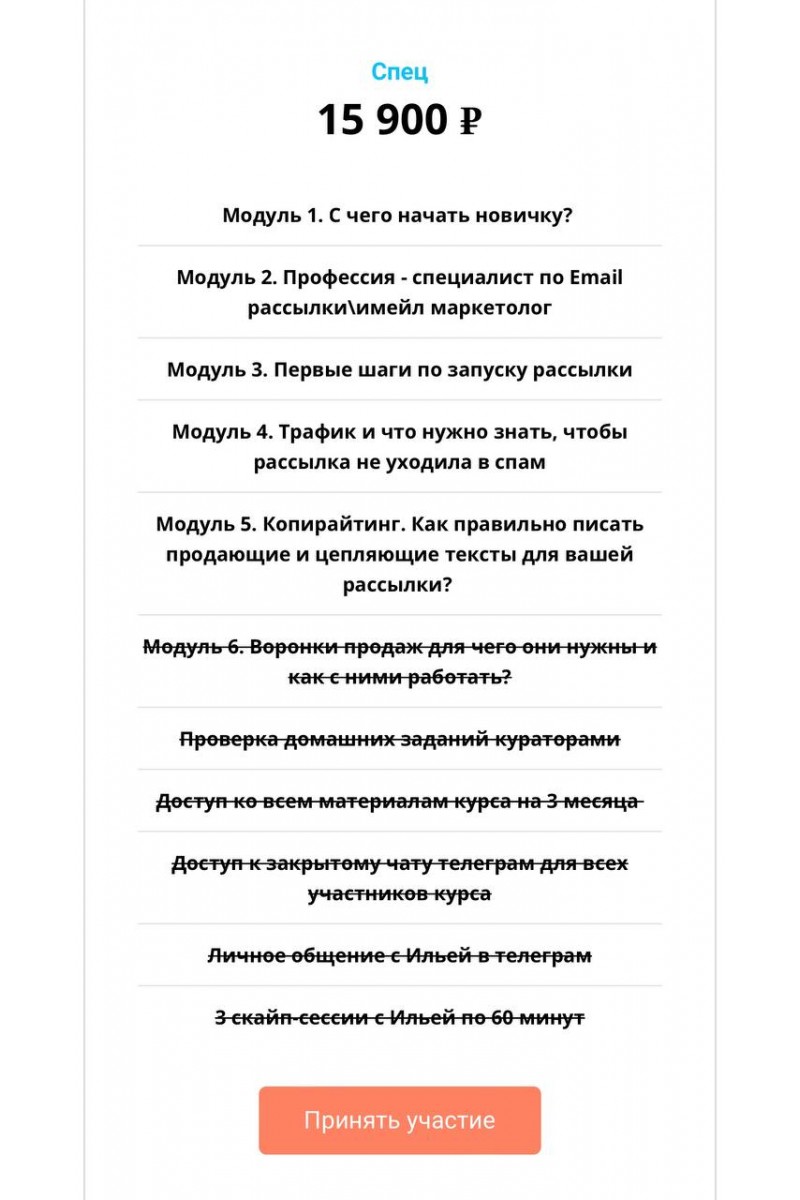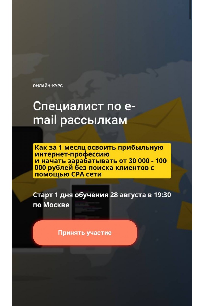 Как за 1 месяц освоить прибыльную интернет-профессию и начать зарабатывать от 30 000 - 100 000 рублей без поиска клиентов с помощью CPA сети.Почему специалист по Email рассылкам?Это востребованная профессия: достойно оплачивается и дает возможность развиваться. Специалист по рассылке может работать удаленно, совмещая несколько проектов.Кому подойдет наша обучающая программа?1. Новичкам, которые хотят сменить род деятельностиВам не нужно обладать специальными сложно техническими навыками. Достаточно иметь компьютер, интернет и желание зарабатывать. Всему остальному Вы сможете научиться у нас.2. Продвинутым веб-мастерам, которые хотят увеличить свой доходНаучим вас новым прибыльным связкам.3. Тому кто ищет дополнительные источники заработка или хочет совмещать с основной работойДля того чтобы начать зарабатывать вам будет достаточно уделять по 2-4 часа в день.Почему выгодно работать с CPA сетями?В CPA сетях они же партнерские программы размещены проверенные рекламодатели с лучшими товарами/услугами на рынке.Вам не нужно искать себе клиентов, вы выбираете понравившегося вам рекламодателя и начинаете с ним работать.Так же СPA сеть гарантирует выплату заработанной вами суммы и вам не нужно переживать, что вам могут не заплатить.Содержание курса:Введение. С чего начать новичку?Способы e-mail рассылок. Сбор и покупка базы. Проверка базы на валидностьСоздание серверов для рассылки. Способы прогрева серверовПочему нужно осваивать 3 респондера. Рассылаем Falcon, MassDelivery. Настраиваем трафик онлайн через другие респондерыАналитика последней рассылки (показатели - CPA, Постмастер, Респондер). Epc, качество трафика, клики, конверсии и т.д.Как отправлять хоть 1000000 писем. Настраиваем трафик через AMS, через SMTP. Вывод серверов из банаСтруктура теста и заголовок. Тема - идея - проблема - решение - вывод. Как определиться с темой и четко отразить её в заголовкеВсё о стоп-словах и версткеПринципы работы воронки продаж (как это работает в e-mail рассылках). Как анализировать лендинги и рассылки в воронкеОтветы на вопросыАвторы курса:Верушкин Семён - владелец CPA-сети Lead-Magnet - 24000 зарегистрированных партнера и 65+ проекта в работе. В клиентах: Сбербанк (Деловая среда), Тинькофф, Бизнес молодость, Тони Роббинс в Олимпийском +250 клиентов. 10 лет в интернет маркетинге. 8 лет в онлайн заработке. Уже 5 лет назад осваивал бюджеты от 3 000 000 рублей в месяц. Максимальная прибыль за 1 месяц с арбитража 3 000 000 рублей. Участник закрытых клубов и сообществ ("CPA Club", "Мастер-майнд по онлайн образованию"). Побывал в 24 странах.Процевский Илья - эксперт в Email рассылках. Руководитель отдела по рассылкам Lead-Magnet. Руководитель и ведущий потоков учеников в Академии Трафика Lead-Magnet. Занимается интернет рекламой более 10 лет. Работал с большинством бизнесов. Вывел более 50 человек на доход от 40 000 - 150 000 тысяч рублей в месяц на рекламе в интернете. Потратил более 10 млн рублей рекламного бюджета.Тариф: СпецФормат: Видеозаписи вебинаров