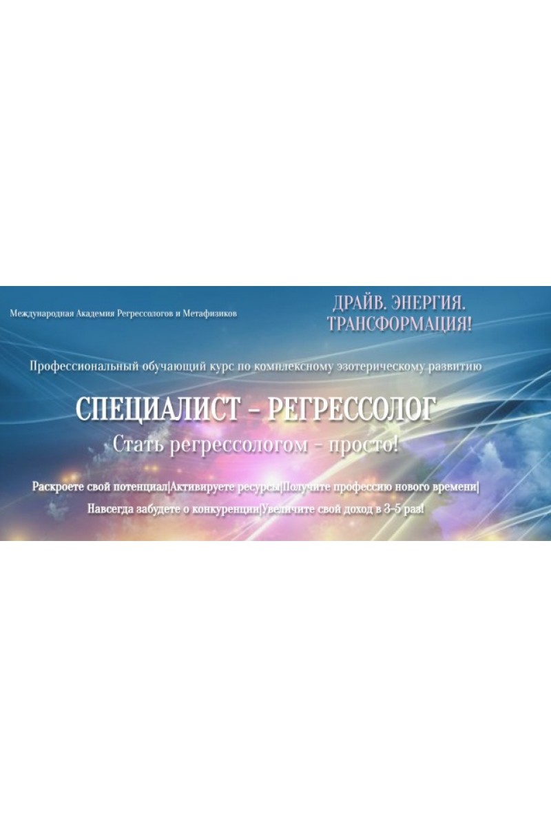 За 2 месяца обучения:— Вы раскроете в себе талант регрессолога и сможете погружать в прошлые жизни практически кого угодно, где угодно и когда угодно.— Почувствуете себя по настоящему ценным, полезным и нужным специалистом для сотен людей.— Сэкономите 4 – 5 лет своей жизни на обучении кармической психологии и 2 года на изучении теории о возможностях регрессивного гипноза.— Забудете о тренингах личностного роста и саморазвития — откроете доступ к ресурсам и жизненной энергии через познания себя.— Поднимите свои профессиональные навыки на новый уровень.— Станете гуру для самого себя и скажите «прощай» своим блокам, препятствиям и страхам много зарабатывать.— Достигнете реально ощутимых результатов.— Превратите ваши мечты в стиль жизни.— Сделаете этот мир лучше благодаря реальной помощи людям!— Поменяете свой статус и получите диплом Академии регрессологов!Обучающая программа курса состоит из 6 модулей:Перед началом обучения всем участникам предоставляется доступ к вводному занятию - "Я нужен людям! " Прокачиваете основную сферу своей личности через регрессию в прошлую жизнь.Модуль 1. Секрет успешного регрессолога.— Почувствовали себя уверенным специалистом регрессологом.— Обрели превосходную уверенность в себе, дающую вам энергию для работы.— Изучили метод Линкольна в работе регрессолога. Открыли в себе неиссякаемый источник вдохновения.— Стали супергероем для самого себя и разблокировали свои безграничные способности.— Начали воплощать свои мечты в реальность за счет безусловной ценности себя.— Избавились от необходимости зависеть от чего-либо мнения. Победили страх оценки окружающих, при помощи техники «скрытого комплимента».По итогу модуля 1: Вы раскрыли свой потенциал. Открыли в себе талант регрессолога. Стали гуру для самого себя. Распрощались со своими блоками, возражениями и страхами.Модуль 2. Регрессия — как ментальное преображение.— Можете простыми словами объяснить возможности регрессии вашим клиентам.— Получили знания о научном обосновании методики регрессивной терапии.— Узнали, почему мы рождаемся с абсолютно чистой памятью.— Исследовали, что на самом деле происходит во время регрессии в прошлую жизнь.— Овладели самыми эффективными мировыми практиками погружений в прошлые жизни, проверенные годами на десятках тысяч людей.— Освоили технику безопасности при работе с клиентами.— Научились получить максимальную пользу от регрессии.По итогу модуля 2: Вы изучили методику. Теперь вы с легкостью можете объяснить любому человеку о мощной пользе регрессий в прошлые жизни так, что он захочет попасть на сессию именно к вам, даже если ему придется ожидать своей очереди.Модуль 3. Трансовые техники — как ключ к успешным погружениям.— Обучились пользоваться простыми гипнопробами, даже если раньше вы этим не владели.— Получили самую эффективную технику безопасности для вхождения в трансовые путешествия.— Освоили самый простой способ расслабления через медитацию и визуализацию.— Изучили, чего стоит избегать при медитации и визуализации.— Осознали, в чем разница между гипнотическими и негипнотичсекими погружениями.— Получили главные техники доступа к особым способностям подсознания.По итогу модуля 3: Вы можете входить в нужное эмоциональное состояние. Готовы проводить самостоятельно сесси