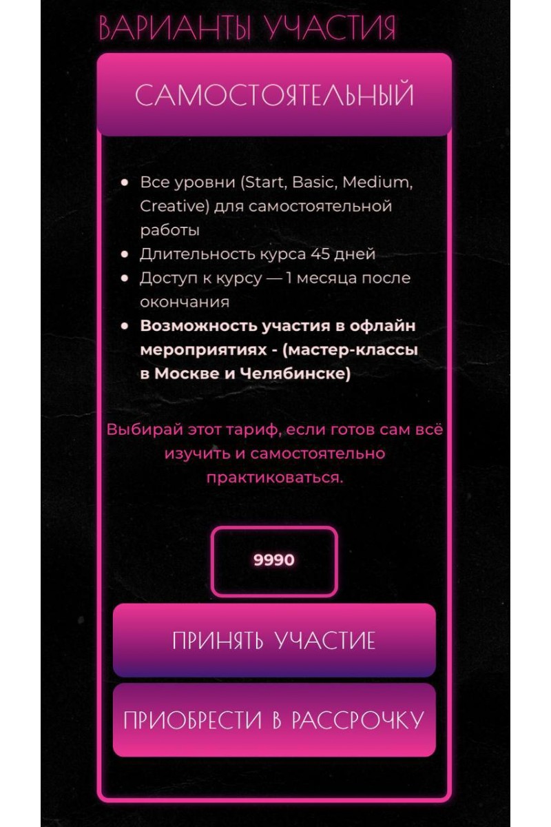 Этот курс для тебя, если ты:Никогда не снимал и не монтировал. На курсе ты научишься делать это с нуля и сможешь набрать аудиторию себе или заработать, создавая видео для другихСнимаешь, но хочешь круче. Я помогу тебе сделать из хобби сильный навык, чтобы развиваться в сфере видеоПрофи, который всегда растет. Тренды меняются быстро. Нужно перенимать опыт, чтобы оставаться в топе. На моём курсе даже профессионал найдёт для себя ценную информациюБлогер. В Instagram, TikTok или другой соцсети — тогда тебе срочно нужно на курс, чтобы не отстать от других блогеров и завоевать внимание аудитории, получать подписки, лайки, репостыЭксперт. Твои продукты и знания можно легко продвигать и продавать с помощью видео, главное — знать важные нюансы, которые я даю на курсеДелаешь бизнес. Что-то продаёшь или оказываешь услугу — уникальные видео привлекут внимание клиентов и повысят продажиТы научишься:Жить в кадре, быть свободным перед камеройЧувствовать музыку, ритм и битыПонимать тренды и запросы аудитории на контентКреативить и находить оригинальные решенияКак у тебя это получится? Легко! Потому что ты освоишь:Секреты и тонкости монтажаТрендовые переходы и склейки - все фишки и приёмы, которые видеоблогеры держат в секретеАлгоритм съемок: научу прописывать всё по шагам, чтобы снимать легко, быстро и с эффектом "Хочу пересмотреть!"Как снимать, если нет красивого фона, дорогого оборудования, опыта монтажа - лайфхакиТариф СамостоятельныйВсе уровни (Start, Basic, Medium, Creative) для самостоятельной работы