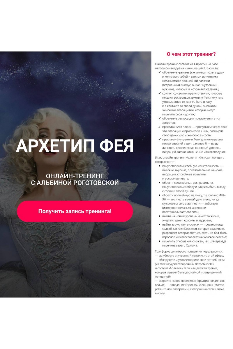О чем этот тренинг?Онлайн-тренинг состоит из 4 практик на базе метода символдрама и инициаций Т. Василец:обретение крыльев (как символ полета души и контакта с собой и своими истинными желаниями) и волшебной палочки (встроенный Анимус, он же Внутренний мужчина, который и исполняет желания);контакт со своими препятствиями, которые не дают раскрыться архетипу Фея, получать удовольствие от жизни, быть в ладу и в контакте со своей душой, высокими женскими вибрациями, которые могут исцелять себя и других;обретение ресурса для преодоления этих запретов;практика «Фея плюс» — пропускаем через тело эти вибрации и привыкаем к ним, расширяя свою денежную и женскую емкость;практика «Внутренняя Фея» для интеграции новых энергий в центральное Я — вашу личность для перехода на новый уровень вибраций, жизни, отношений и благополучия.Итак, онлайн-тренинг «Архетип Фея» для женщин, которые хотят:почувствовать целебную женственность — высокие, вкусные, притягательные женские вибрации, способные исцелять и восстанавливать;обрести свои крылья, расправить их, почувствовать свободу и радость быть в ладу с собой и своей душой;обрести волшебную палочку, т.е. баланс ИНЬ-ЯН — это и есть вечный двигатель, когда мужское начало в личности — действует (исполняет желания), а женское восстанавливает его силы;выйти на новый уровень качества жизни, энергии, денег, красоты и здоровья;выйти замуж, фея в сказках — предвестница свадеб, как Фея Крестная, которая одаривает, разрешает сепарироваться, ехать на бал, быть взрослой и благословляет на женское счастье;исцелить отношения с мужем, как Шахерезада исцелила своего Султана.Транформация нового поведения через рисунки:вы уберете внутренний конфликт в этой сфере,обнаружите и удовлетворите свои потребности (из этих неудовлетворенных потребностей и состоит «болевое» тело или детская травма, которая мешает быть достойной и защищенной женщиной),встроите новое поведение (креативное для вас сейчас)поведение Взрослой Женщины (вместо ребенка или гипермамы) с опорой на себя и свою выгоду.