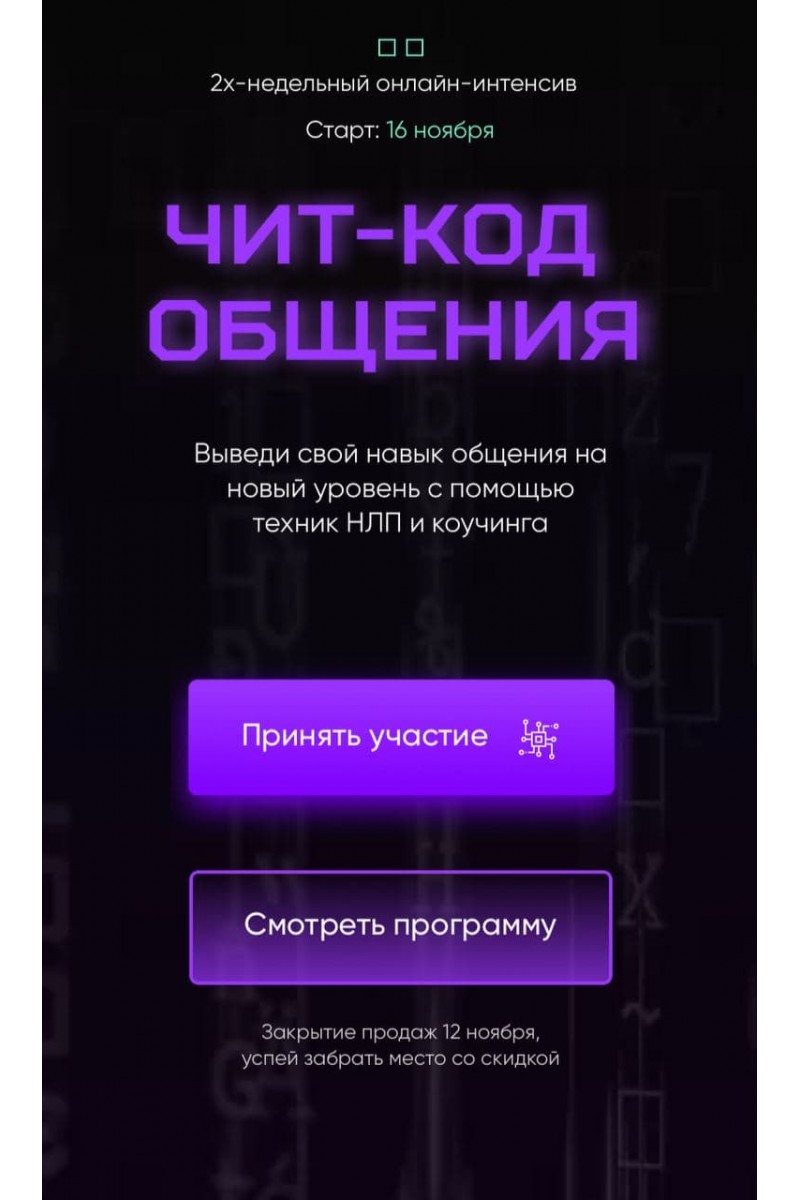 ДЛЯ КОГО ИНТЕНСИВ:Для школьников и студентовнаучишься общаться со сверстниками, вливаться в компании, перестанешь сидеть в углу на мероприятиях, а затем винить себя за это, начнешь наконец-то смело высказываться на уроках/парах, не боясь осужденияДля тех, кто работаетнаучишься грамотно выстраивать диалог с коллегами, перестанешь бояться людей, которые выше тебя по статусу, научишься убеждать клиентов и склонять их к покупке твоего продукта/услуги, научишься правильно презентовать себяДля всех, кто хочет общаться эффективнееопираясь на конкретную систему и убрав внутренние страхи и ограниченияОБЩАТЬСЯ В РАЗЫ ЛЕГЧЕ, КОГДА ЕСТЬ СИСТЕМА:Этапы любой эффективной коммуникации:Калибровка - Подстройка - Раппорт - ВедениеПод каждый из этих этапов есть свои техники:● Более 10 пунктов для калибровки – «чтения» состояния собеседника● Более 12 способов «подстройки» и «отстройки» = расположения к себе человека● 7 техник для работы со страхом общения● Список «Раскрывающих» коучинговых вопросов