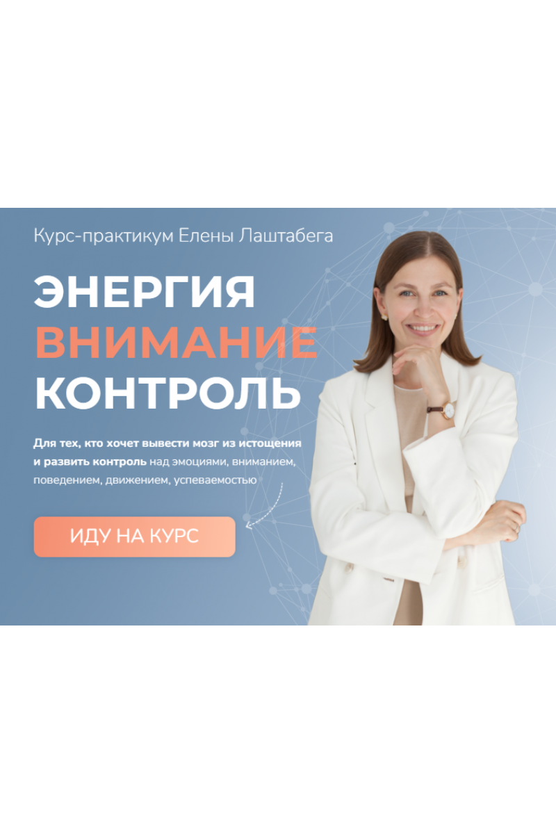 Курс-практикум Елены ЛаштабегаДля тех, кто хочет вывести мозг из истощения и развить контроль над эмоциями, вниманием, поведением, движением, успеваемостьюИнтенсив состоит из 4-х вебинаров от специалистов, занимающихся коррекцией состояния детей СДВГ:НейропсихологПсихиатрИнтегративный невролог НутрициологДЛЯ КОГО ЭТОТ ИНТЕНСИВ- Для родителей детейс диагностированным СДВ и СДВГ- Для родителей, чьи дети не имеют диагноза,но проявляют чрезмерную активность, импульсивность, раздражительность,расстройства внимания, проблемы с эмоционально-волевой сферой- Для специалистов, работающих с детьмиСДВ и СДВГ