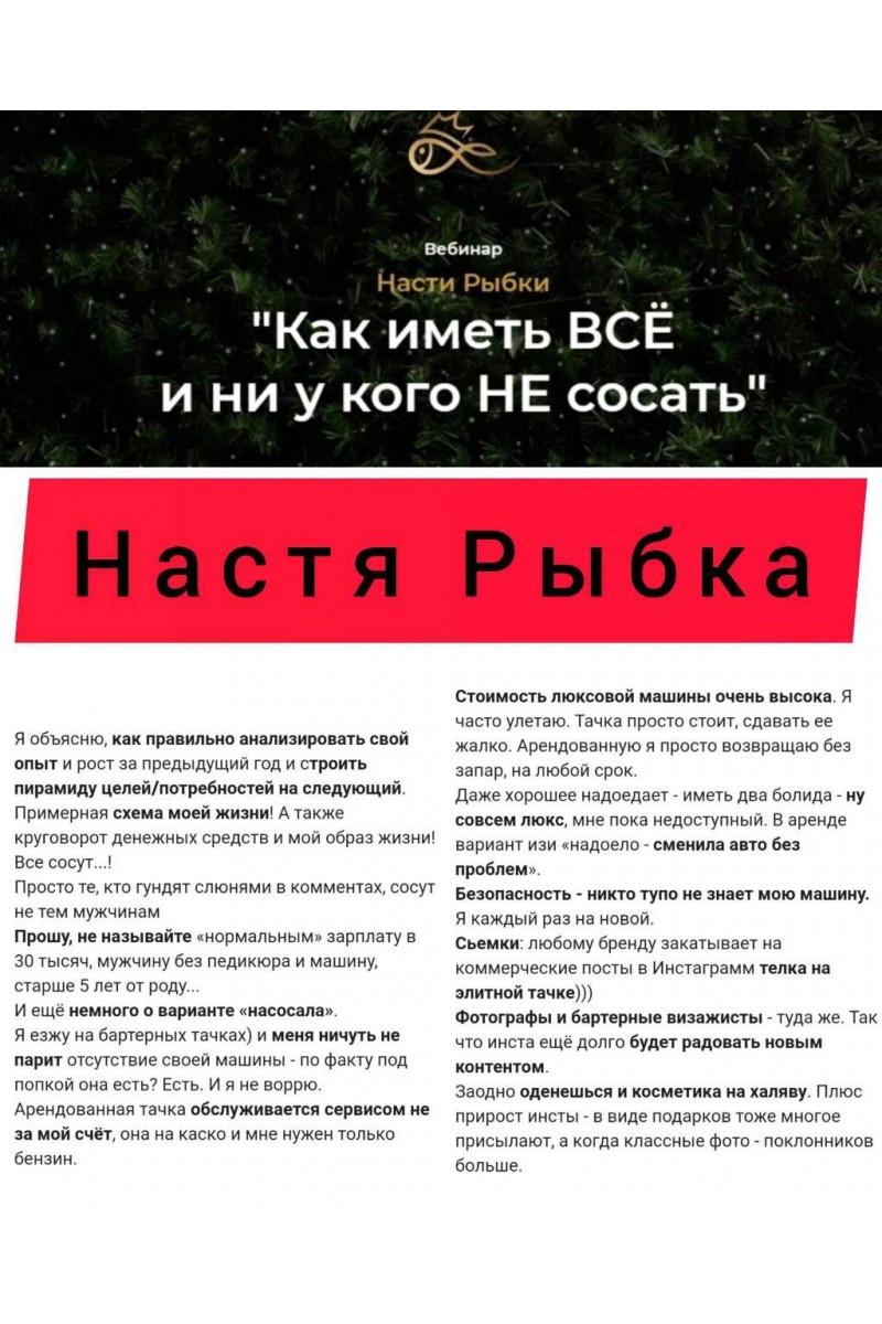 Я объясню, как правильно анализировать свой опыт и рост за предыдущий год и строить пирамиду целей/потребностей на следующий.Примерная схема моей жизни! А также круговорот денежных средств и мой образ жизни!Все сосут...!Просто те, кто гундят слюнями в комментах, сосут не тем мужчинамПрошу, не называйте «нормальным» зарплату в 30 тысяч, мужчину без педикюра и машину, старше 5 лет от роду...И ещё немного о варианте «насосала».Я езжу на бартерных тачках) и меня ничуть не парит отсутствие своей машины - по факту под попкой она есть? Есть. И я не воррю.Арендованная тачка обслуживается сервисом не за мой счёт, она на каско и мне нужен только бензин.Стоимость люксовой машины очень высока. Я часто улетаю. Тачка просто стоит, сдавать ее жалко. Арендованную я просто возвращаю без запар, на любой срок.Даже хорошее надоедает - иметь два болида - ну совсем люкс, мне пока недоступный. В аренде вариант изи «надоело - сменила авто без проблем».Безопасность - никто тупо не знает мою машину.Я каждый раз на новой.Сьемки: любому бренду закатывает на коммерческие посты в Инстаграмм телка на элитной тачке)))Фотографы и бартерные визажисты - туда же. Так что инста ещё долго будет радовать новым контентом.Заодно оденешься и косметика на халяву. Плюс прирост инсты - в виде подарков тоже многое присылают, а когда классные фото - поклонников больше.