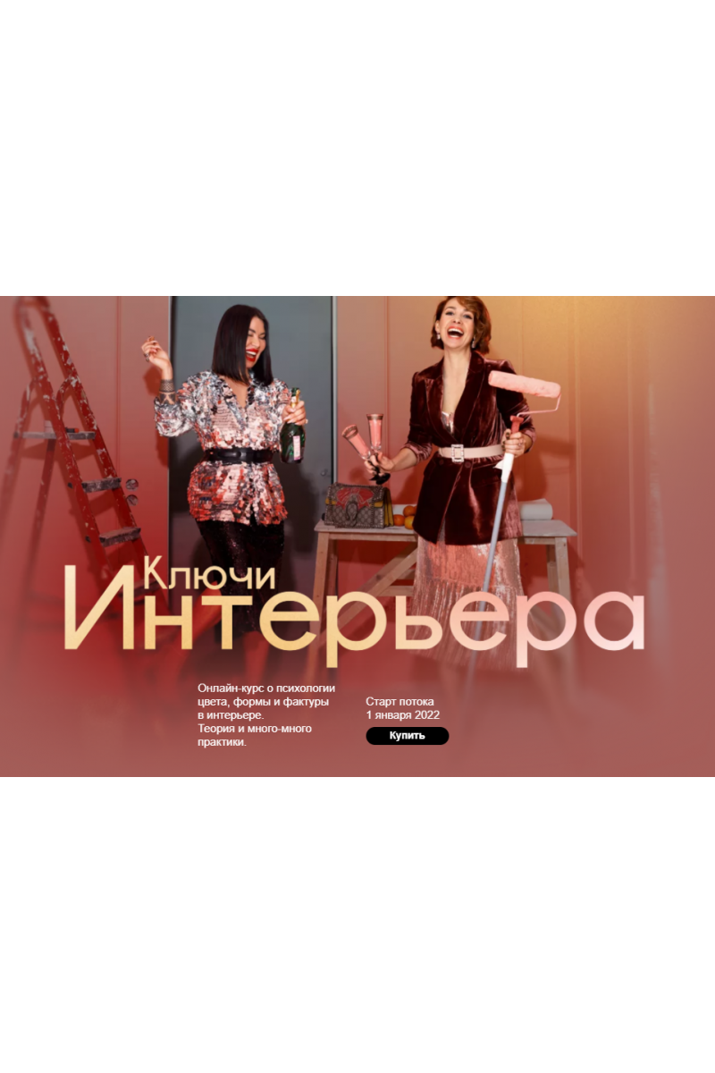 Автор :Рада Русских.Старт :1 января 2022 г.Онлайн-курс о психологии цвета, формы и фактуры в интерьере.Теория и много-много практики.Содержание курса:Психология восприятия цвета, формы, фактуры и их сочетанийв интерьереТеория ключей интерьера на примере 50 предметов мебели и декора.Как собрать из ключей интерьер, который нужен именно вам.Разбор реального интерьераКлючи спальни, кухни, входной группы.20+ идей для вашего интерьера.Реалити: ремонт гостинойдля семьи за выходныеРада и Ольга своими руками ремонтируют помещение площадью 24 кв. м.В их распоряжении два дня и 50 000 ₽.Прикладные советы: как снять обои, как отмыть кисть от краски.ДОСТУП К КУРСУ НА ГОДчтобы вдохновиться на ремонти сделать его