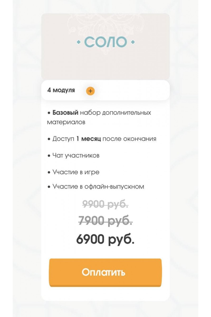 Программа курса:Модуль 1.Модуль 1.Модуль 2.Модуль 3. Системная причинаМодуль 4. Духовная причина и кармические уроки• Базовый набор дополнительных материалов• Доступ 1 месяц после окончания• Чат участников• Участие в игре