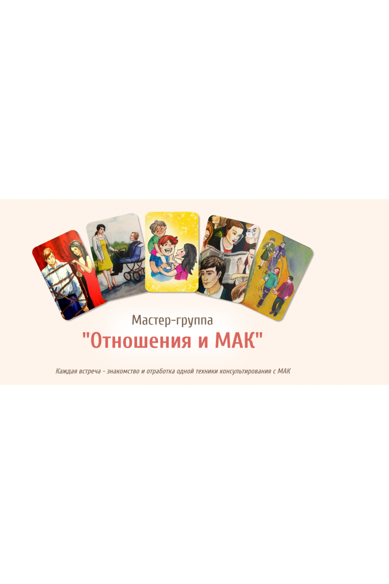 Тема мастер-группы «Отношения»Отношения- наиболее актуальная тема, по поводу которой к нам часто обращаются клиенты. Это:✔ отношения с собой✔ отношения с партнером (бывшим, настоящим, будущим)✔ отношения с детьми✔ отношения с родителями, братьями, сестрами (с родом)✔ отношения с друзьями✔ отношения с профессиональным коллективомЧто будет?- 2 диагностические техники- 5 техник- 7 методичек- Книги по работе с темой отношений- 3 комплекта МАК- 3 схемы-подложки для МАК- 5 видеозаписей встречРасписание:День 1. «Колесо отношений». «Круги интимности». «Что не так?»Техники, позволяющие выделить проблемные, «болевые» точки в отношениях, наметить пути работы над ними.День 2. Техника «Светофор границ в отношениях»Техника помогает клиенту осознать границы допустимого и недопустимого поведения по отношению к себе со стороны окружающих, понять, как их выстраивать.День 3. «Беру - отдаю»Техника позволяет понять клиенту, равноценен ли его «вклад» в отношения, есть ли баланс; осознать личную ответственность за поступки, действия, увидеть, с помощью чего можно привести отношения в состояние баланса.День 4. «Моя семья»Техника позволяет проанализировать особенности существующих взаимоотношений с близкими, отследить такие параметры, как: дистанция, объединяющие чувства, состояния и пр. Позволяет смоделировать желаемые отношения, направить фокус внимания на их улучшение.День 5. «Уроки отца и матери»Техника позволяет с помощью работы с образом отца и матери получить ресурсы для самореализации.