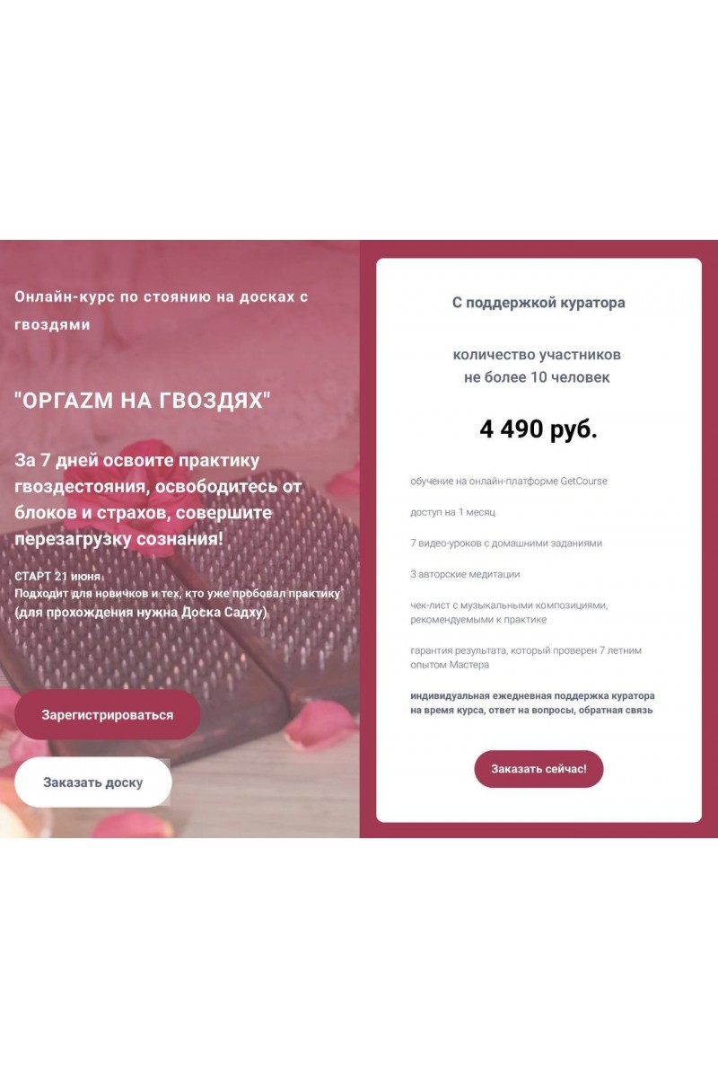 Онлайн-курс по стоянию на досках с гвоздями.Улучшение здоровьяВ ступнях находится множество нервных окончаний, которые связаны со всеми органами. Глубоко воздействуя гвоздями на акупунктурные точки, мы активируем важные процессы в организме, усиливаем приток крови и энергию в организме. Тело испытывает стресс, иммунная система начинает работать активней. Происходит омоложение организма. ⠀Избавление от страховВ процессе практики начинают всплывать ваши страхи и блоки. Стоит только посмотреть сквозь боль, и вы увидите, что вас сдерживает, какие детские травмы и обиды всплывают наружу. Здесь важно их увидеть, принять, поблагодарить (так как для чего-то они вам были нужны) и отпустить с любовью!Прилив энергииВ процессе практики идет мощная активация энергии. Вы будете испытывать жар, нарастающую силу и пульсирующую энергию в каждой клеточке. После практики повышается уровень эндорфинов в крови. Вы чувствуете силу, энергию, счастье, благодарность!Новое состояниеЕсли у вас есть насущное желание, то с помощью этой практики вы можете запустить его реализацию: понять ваше это желание или нет, позволить себе иметь то, что хотите, войти в состояние обладания желаемым. Вы получаете уверенность и входите в состояние «Я все могу».