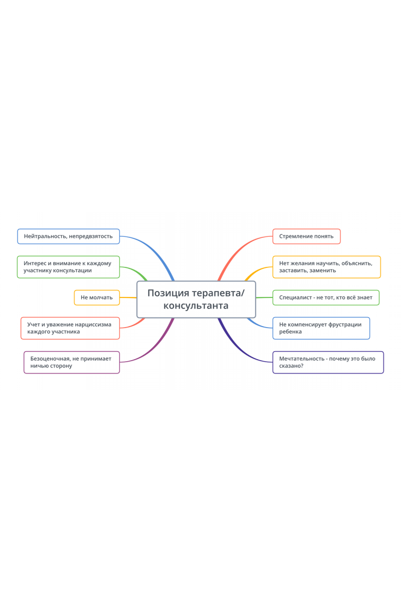 Они касаются как организации кадра - встречи только с родителями, или с родителями и ребенком, отдельно с ребенком, длительность встреч, так и содержания работы: вопрос конфиденциальности, работа с переносом, только разговор или использование вспомогательных средств.