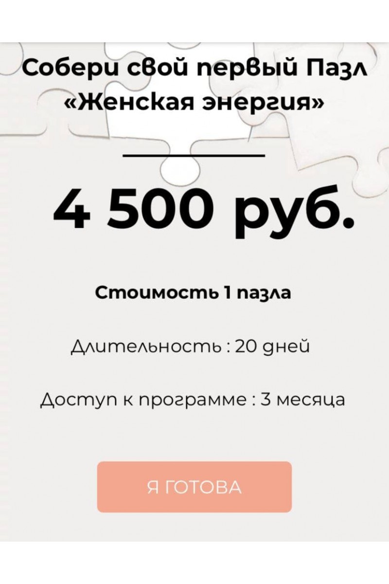 Наш первый пазл: «Женская энергия»Главная задача – увеличить уровень вашей женской энергии и создать ресурсное женское состояние из которого вы сможете творить свою жизнь с радостью и любовью.Что даст тебе Пазл «Женская Энергия»:Избавишься от страхов, блоков и зажимовОткроешь источник вдохновения и наполнения себя энергиейНаучишься расслабляться в условиях постоянного потока мыслейВернёшь себе природную женскую силуНачнёшь жить из состояния изобилия и наполненностиСможешь достигать масштабных целейПрограмма рассчитана на 20 дней.1 день. Что такое женская энергия и сила?2 день. Куда уходит энергия? Работа с негативными установками3 день. Как правильное начало дня может изменить жизнь4 день. Женская и мужская сила. Как перестать играть на чужом поле?5 день. К чему приводит подавление эмоций?6 день. Телесные блоки. Связь энергии и тела.7 день. Исцеление внутреннего ребёнка - источник женской энергии8 день. Как осознать свою жизненную ценность и полюбить себя.9 день. Slow Life. Как замедлиться и наполнить себя энергоресурсом10 день. Медитация + практики