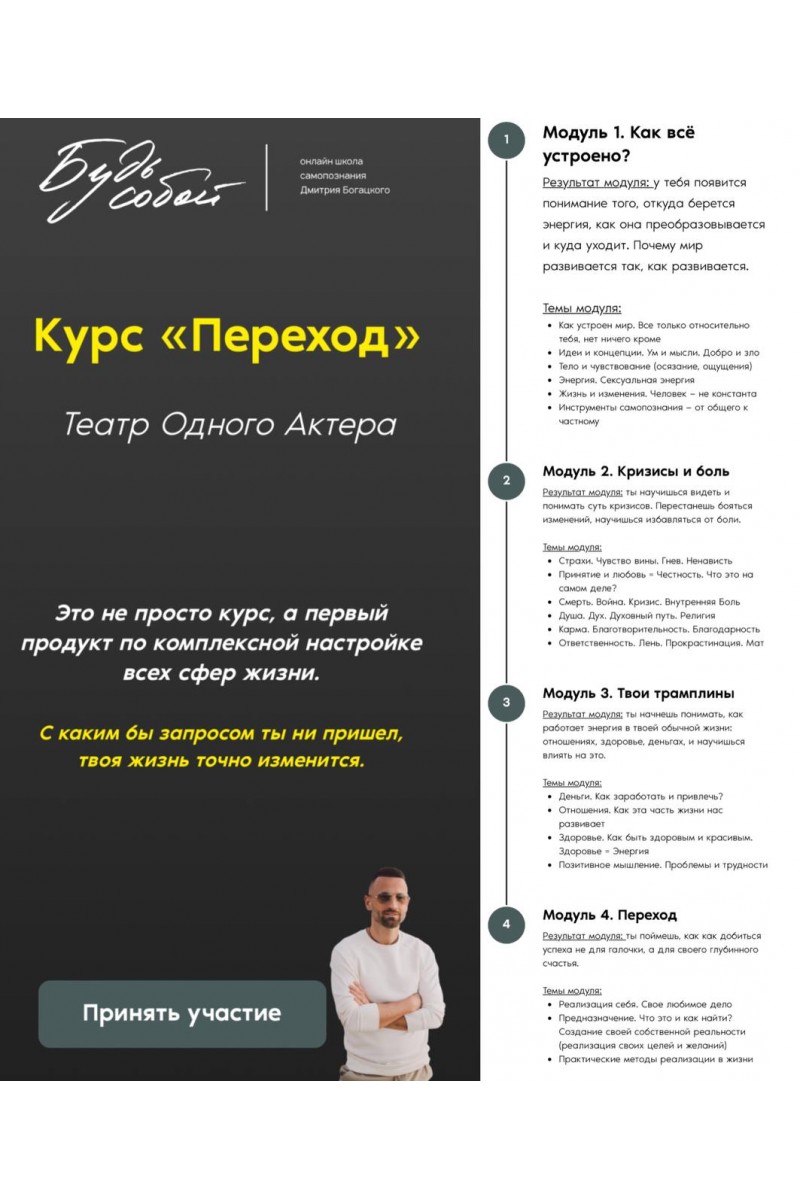 Это не просто курс, а первый продукт по комплексной настройке всех сфер жизни.С каким бы запросом ты ни пришел, твоя жизнь точно изменится.Ну что, друзья, я готов представить вам свой совершенно новый курс, который абсолютно точно является самым глубоким и в тоже время, легким для усвоения.«Переход» - это курс про то, что прямо сейчас мы с вами стоим на важнейшем рубеже жизни, на рубеже смены эволюционных программ. И настало время принять решение: либо сходить со сцены, либо адаптироваться к переменам и осуществить переход в новую реальность.Этот курс про то, как вне зависимости от обстоятельств во всем мире, оставаться собой, в своей энергии и ресурсе.Когда все вокруг рушится, передают хреновые новости, окружающие паникуют, люди теряют работу и себя, но ты остаешься непоколебим! Ты наоборот - растешь и развиваешься. Ты остаешься в изобилии.Этот курс про то, как остаться творцом своей собственной реальности независимо от обстоятельств. Про иллюзию твоего ума, которая мешает тебе жить и проявляться.Про то, как снять эти шоры, принять себя и начать проживать свою настоящую жизнь!Курс «Переход» имеет и второе название - «Театр одного актера». В этом и есть суть программы. Ведь на самом деле, в этом мире нет никого кроме тебя! Осознай это. Твоя жизнь - МОНОСПЕКТАЛЬ, и ты - тот, кто его играет. Одновременно ты - и наблюдатель, и наблюдаемое.Что это значит? Это значит ровно то, что ты сам лепишь мир внутри и проецируешь его во вне - на улицу, на дома, стены и окружающих людей. Если в твоей жизни кризис - ты его создал, если нет денег и продаж - ты это создал, если херовые отношения и нет энергии - …Этот курс про все то, что я говорю и пишу через свои рилс и посты. В нем так же не будет ничего про Дизайн Человека.Этот курс отвечает на вопросы:Как принять себя? Как «быть собой»? Как быть изобильным и успешным в мире нищеты и кризиса? Как с улыбкой проживать самые трудные сценарии жизни?Это будет легкий и простой формат, который не обязывает тебя совсем. Вы можете слушать даже за рулем. Каждая лекция длиться не больше часа, что позволит уму сохранить свежесть и ясность.Ты можешь проходить «Переход» параллельно хоть с 10-ю другими. Легко. К тому же, я буду давать всю информацию очень структурированно.Домашек не будет совсем!Поверь, они и не нужны для настоящей трансформации. Все что тебе будет надо - открыться внутренне и слушать. Все!Программа:Курс состоит более чем из 20-ти лекций.Я так же буду проводить отдельные лекции с ответами на вопросы.1 Модуль. Как всё устроено в новом мире?Ты узнаешь почему мир развивается так, как развивается и куда мы переходим в 2027 году. Как осуществить этот переход, как подготовиться и что необходимо делать. Появится понимание энергии нового времени и как быть в резонансе с ней.2 Модуль. Кризисы и боль.Ты научишься видеть и понимать суть кризисов. Перестанешь бояться изменений, научишься избавляться от боли. Ты начнешь понимать, когда ты скатываешься в тени и научишься быстро выходить из этого состояния в более ресурсное и изобильное.3 Модуль. Твои трамплины.Ты начнешь понимать как работает энергия в обычной жизни: отношениях, здоровье, деньгах. И научишься влиять на это, то есть - научишься жить из состояния изобилия, привлекая его в свою жизнь. Ты узнаешь, что не бывает НЕ РЕСУРСНОГО состояния, если ты проживаешь свою жизнь.4 Модуль. Перехо