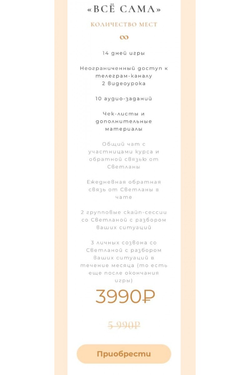 ИГРА - ПРАКТИКУМ ОТ СВЕТЛАНЫ ВОЛОДИНОЙНАУЧИСЬ ПОЛУЧАТЬ И ПРИНИМАТЬ ПОДАРКИ ОТ МУЖЧИН В ЛЮБОЕ ВРЕМЯ ГОДА ИГРИВО, БЕЗ СТЕСНЕНИЯ И НАМЕКОВ НА МЕРКАНТИЛЬНОСТЬПрограмма игрыТЕМА 1ЗНАКОМСТВА С МУЖЧИНАМИ— Где знакомиться?— Как найти достойного мужчину?— Как понять, что это твой человек?— Советы по одежде и внешнему видуТЕМА 2СОСТОЯНИЯ, В КОТОРЫХ ТЕБЕ ДАРЯТ ПОДАРКИ— Как входить в нужные состояния— Твой настройТЕМА 3ПОДАРКИ— Косметика— Духи— Гаджеты— Путешествие— Свидание-впечатление— Одежда— На хобби— Свидание в хорошем месте— КурсыТЕМА 4ТИПЫ МУЖЧИНТЕМА 5СКРИПТЫ ДИАЛОГОВ С МУЖЧИНАМИТЕМА 6ЖЕНСКИЕ СЕКРЕТИКИ
