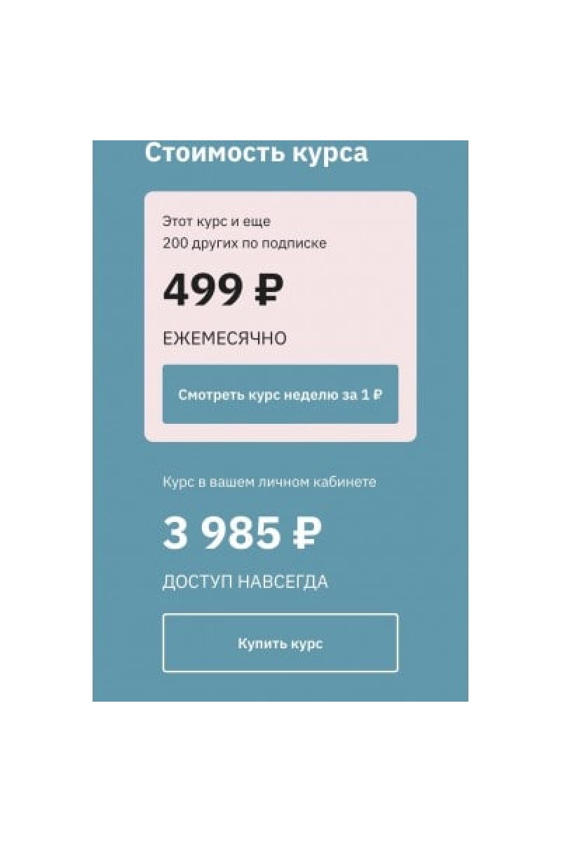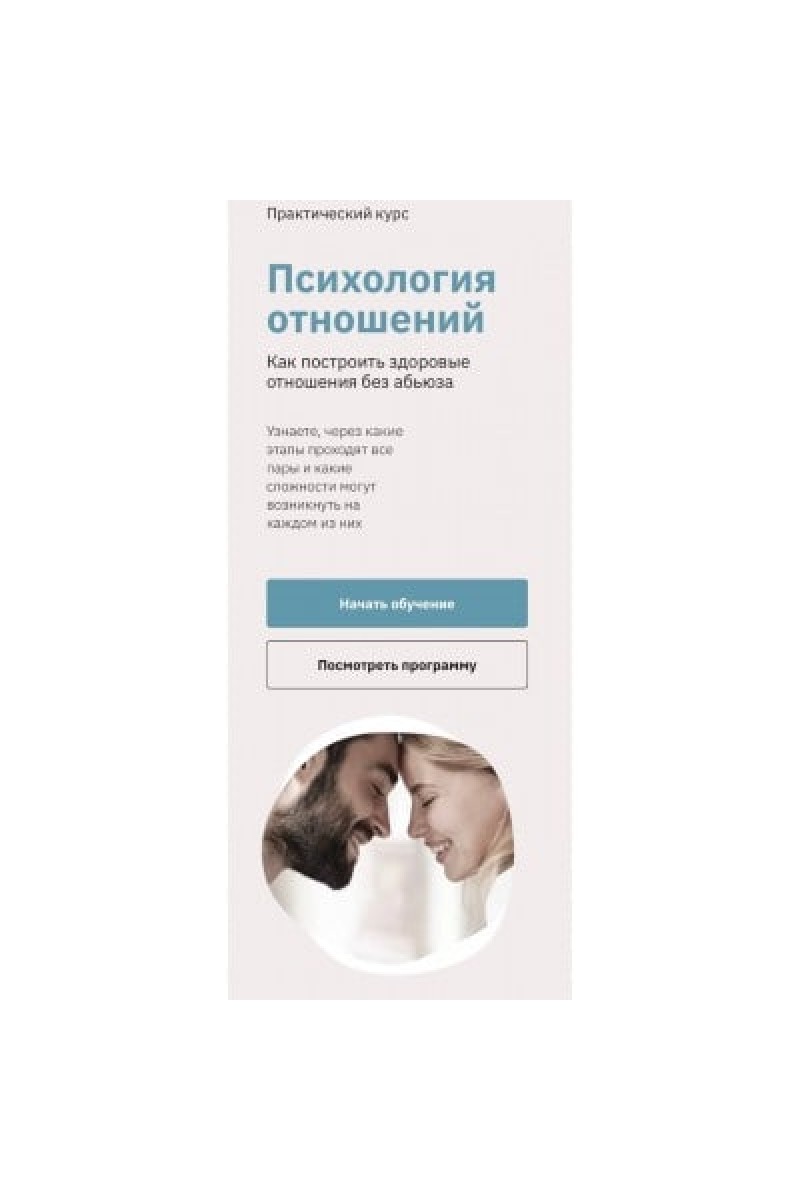 Вам подойдет этот курс, если вы:Испытываете сложности в построении отношений. Хотите понять, какие проблемы мешают на этом путиПереживаете кризис с партнером. Хотите преодолеть его и сохранить отношенияСтолкнулись с абьюзом в отношениях. Хотите выбраться из них и справиться с последствиямиКурс поможет вам:Разобраться, что влияет на гармонию в отношенияхУзнать, как определить вашу совместимостьКонструктивно решать проблемы в общенииНайти баланс между отношениями и личным развитиемПодготовиться к появлению ребенка в семьеРаспознать абьюз в отношениях и понять, что делать при столкновении с нимПрограмма курса:Что такое здоровые отношенияРождение парыРазвитие парыСексуальные отношенияРасширение пары: детиДисфункциональные семьиКак распознать абьюз и защитить себяЗавершение отношенийПродажник: