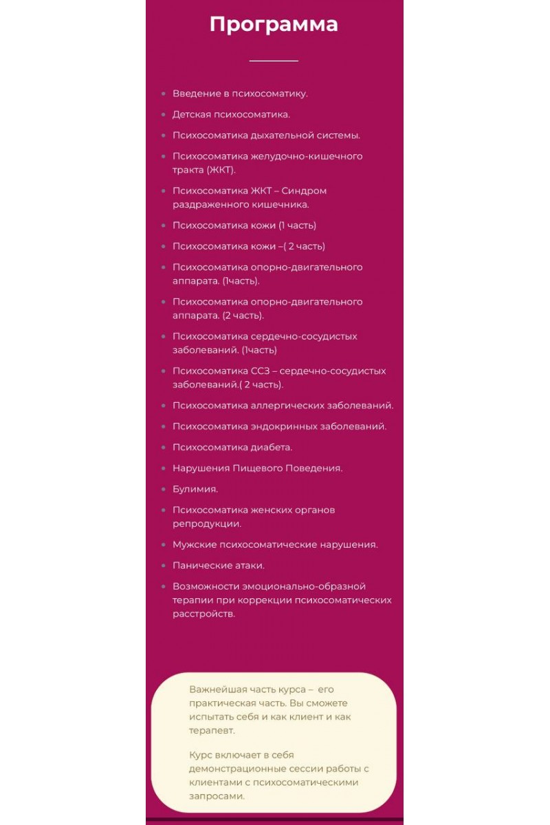 Чтобы быть здоровыми и счастливыми, нам всем необходимо понимать:как психологические процессы влияют на наше телоо чем говорят симптомыкак на них влиять, с помощью специальных техникПрограммаВведение в психосоматику.Детская психосоматика.Психосоматика дыхательной системы.Психосоматика желудочно-кишечного тракта (ЖКТ).Психосоматика ЖКТ – Синдром раздраженного кишечника.Психосоматика кожи (1 часть)Психосоматика кожи –( 2 часть)Психосоматика опорно-двигательного аппарата. (1часть).Психосоматика опорно-двигательного аппарата. (2 часть).Психосоматика сердечно-сосудистых заболеваний. (1часть)Психосоматика ССЗ – сердечно-сосудистых заболеваний.( 2 часть).Психосоматика аллергических заболеваний.Психосоматика эндокринных заболеваний.Психосоматика диабета.Нарушения Пищевого Поведения.Булимия.Психосоматика женских органов репродукции.Мужские психосоматические нарушения.Панические атаки.Возможности эмоционально-образной терапии при коррекции психосоматических расстройств.