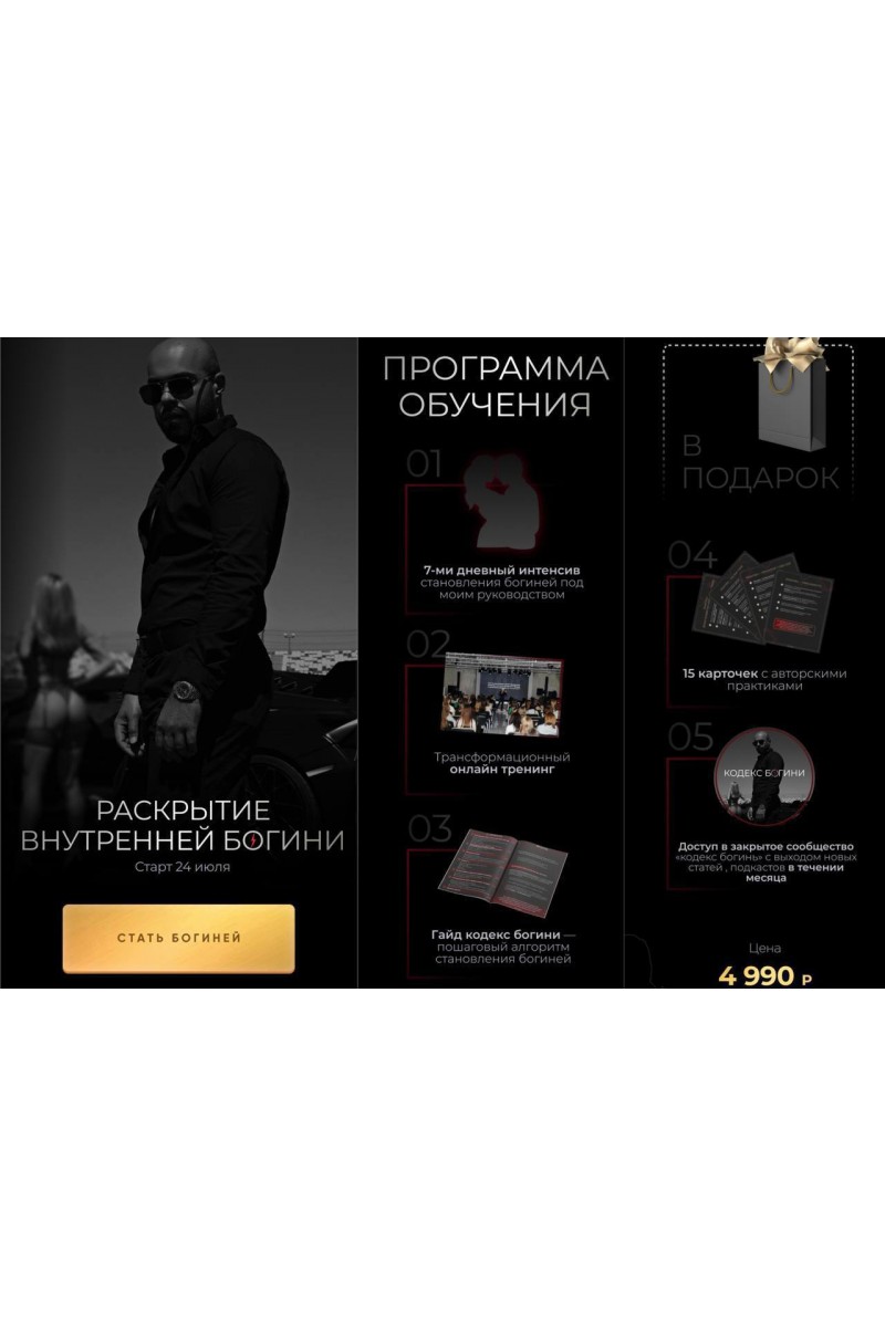 Программа обучения7-ми дневный интенсив становления богиней под моим руководствомТрансформационный онлайн тренингГайд кодекс богини - пошаговый алгоритм становления богиней15 карточек с авторскими практикамиДоступ в закрытое сообщество "кодекс богинь" с выходом новых статей, подкастов в течении месяца