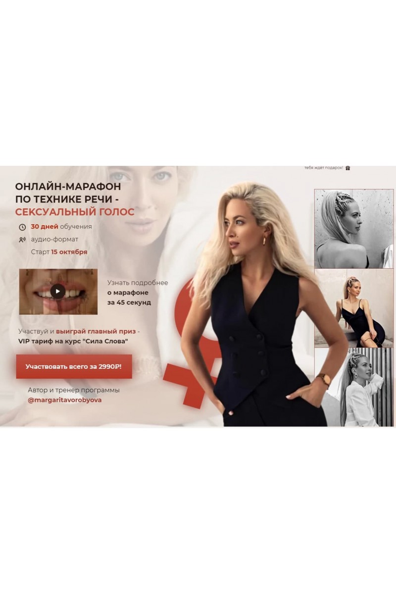 Марафон для тех, кто c помощью упражнений хочет:Сделать голос бархатистым и соблазнительнымЗвучать так, чтобы с первых нот привлекать мужчинуПонизить тембр и освободить голос от зажимовОбрести уверенность в себе и полюбить свой голосКак проходит марафон?Марафон проходит в формате голосовых сообщений в закрытой группе в WhatsAppАудио эфиры всего 8 штукДомашние задания нужно будет выполнять в формате видео и аудиоДомашнее задание ученик направляет в личные сообщения Маргарите и получает обратную связь
