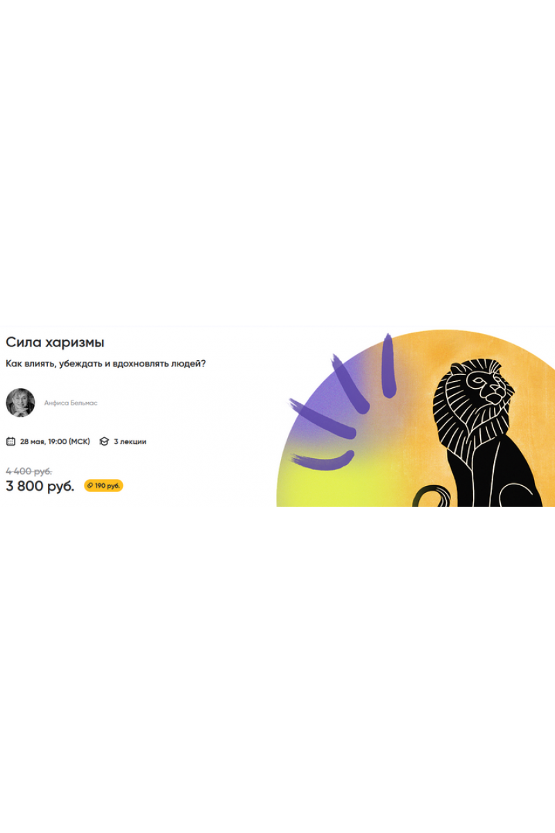 Анфиса Бельмас, автор онлайн курсов «Мастерская переговорщика» и «Мастерская оратора», расскажет обо всех преимуществах харизматичного человека и даст практические советы по развитию собственного обаяния. Вы узнаете, как перестать бояться быть заметным и научитесь управлять стилем харизматичного поведения, подходящим именно вам.