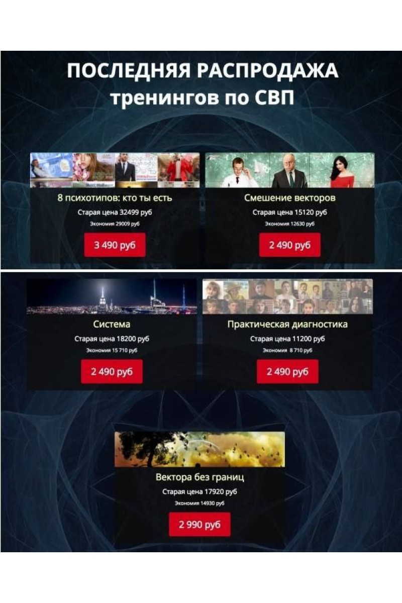 Самая полная складчина по СВПСостоит из 5 курсов, которые позволят полностью изучить векторыНекоторые курсы впервые на складчикеСистема векторов — это современная психологическая методика, которая позволяет получать информацию о человеке, обо всех значимых сферах его жизни по любым внешним и внутренним проявлениям. Это помогает не только глубже понять себя, но и найти индивидуальный подход к каждому человеку для получения желаемого результата: как в личных, так и в деловых отношениях.