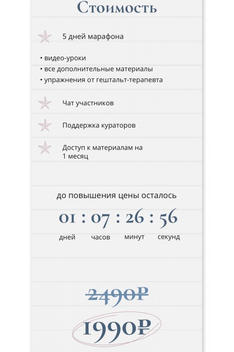 Приведи в гармонию волнующие тебя сферы жизни, научись легко решать проблемы по учебе / работе / личным отношениям через грамотную систему постановки целей и систему мотивацииПрограмма:Подготовительный деньВводный Live-вебинар• Мой опыт: как я достигаю свои цели?• Секреты организации и мотивация создания «Папки Жизни»• Как поддерживать энергию и запал в течение марафона.РезультатПодготовишь всё необходимое для прохождения марафона, а также зарядишься энергией перед стартом, чтобы точно дойти до конца.25 декабряНа марафоне ты сможешь взглянуть на свою жизнь системно, подвести итоги года, выявить истинные желания и создать свою «Папку жизни» — настоящий план действий для достижения своих целей на 20211 день. Анализ уходящего годаВидео-практикум на 30-40 минут:• Как правильно проанализировать год и не повторить своих ошибок в следующем?• Упражнение "Неправильное колесо баланса или Вспомнить все!", чтобы увидеть, что какие сферы надо подтянуть, чтобы в жизни чувствовалась гармония?• Мощное упражнение от гештальт-терапевта, чтобы отпустить незавершенные ситуации и конфликты годаРезультатВзглянешь системно на то, что происходило в 2020, сделав нужные выводы. Увидишь свой прогресс / регресс по сферам жизни и точки роста на следующий год. Появится ощущение свободы, завершенности, удовлетворенности, отсутствия каши в сердце и в голове.26 декабря2 день. Выявление своих истинных целей и желаний• "Ложные цели" и как они забирают энергию? Как найти их у себя и освободить силы на по-настоящему важное и нужное?• Погружающая аудио-медитация с внедрённой техникой из психотерапии: выявляем собственные мечты и цели и определяем, кем на самом деле хотим быть?• Упражнение от гештальт-терапевта "Приоритет желаний", чтобы понять, на чем именно фокусироваться в 2021РезультатОкунёшься в глубину себя и откроешь мечты и желания, о которых даже не подозревал. Затем сможешь определить, на какие из всех многочисленных желаний стоит сделать акцент и какие дадут качественно новый уровень жизни.27 декабря3 день. Составляем рабочий план по достижению целей на ближайший год• Почему не получается достигать цели?• Как создать привычки, которые будут способствовать более легкому и приятному достижению целей?• Как обрести мышление человека, который всегда достигает желаемого?• Видео-упражнение «Тайна моих успехов и неудач", чтобы понять, в чем вы по-настоящему хороши и выявить те качества, которые ускорят достижения ваших целейРезультатУ тебя на руках пошаговый план действий, которые нужно выполнять каждый месяц, каждую неделю или каждый день, чтобы решить проблемы в важных тебе сферах и через год сказать себе: "Вау, я смог!"28 декабря4 день. Как не терять мотивацию в течение года?• Видео-урок «Нестандартный взгляд на понятие "Мотивация"»• Почему какие-то действия даются очень легко, а какие-то приходится "вымучивать"? И что сделать, чтобы "вымучивать" не приходилось?• Почему мотивация так легко пропадает и как взять над ней контроль?•Как найти энергию действовать, когда сил совсем нет?•Как отличить отсутствие мотивации от простого желания отдохнуть?•Практика "Создание мотивационного помощника"РезультатТы знаешь, как себя заряжать в сложные моменты или если вдруг не хочется ничего делать.30 декабря — 5 день. Живой вебинар с ответами на вопросы и подведение ит