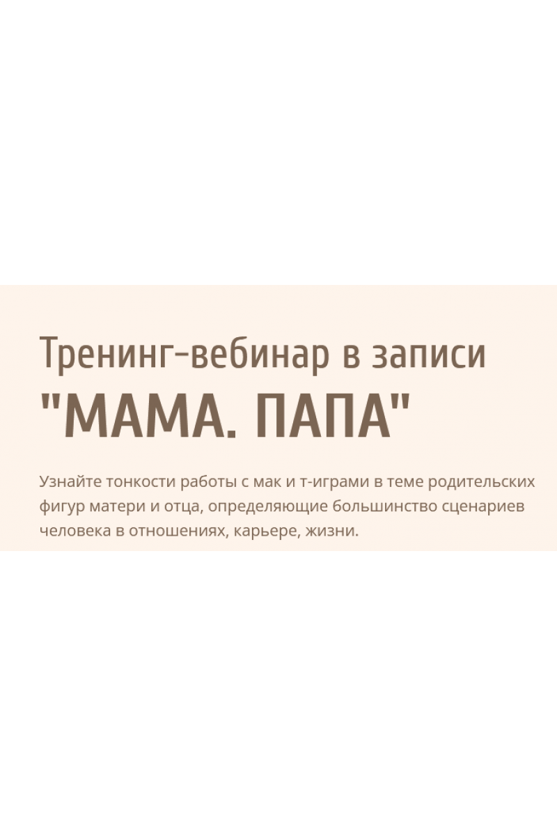 Тренинг нужен Вам, чтобы:- Узнать о направлениях работы с образом матери и отца в практике консультанта.- Получить интересные и глубокие техники в данной теме.- Получить новые знания, опыт и именной сертификат.- Попрактиковать техники на себе и получить терапевтический эффект.ЧТО ВХОДИТ В ТРЕНИНГ:4 видео-лекции4 практики с МАК2 методички для самостоятельной работыСОДЕРЖАНИЕ ВИДЕОВидео 1✔ Знакомство с МАК✔ Практика с МАК: «Фигура матери»✔ Рекомендация мак-колод в данной темеВидео 2✔ Практика с МАК: «Фигура отца»✔ Послания от родительских фигур+ Методичка «Практика благодарности»+ Методичка «Практика принятия мамы и папы»Видео 3✔ Знакомство с трансформационными играми✔ Практика с т-игрой по работе с чувствами к маме и папе✔ Рекомендации т-игр в данной темеВидео 4✔ Внутренний ребёнок.✔ Ресурсы внутреннего ребенка в жизни взрослого✔ Примеры из практики – что бывает, когда внутренний ребенок в Тени✔ Практика МАК «Все мы из детства»