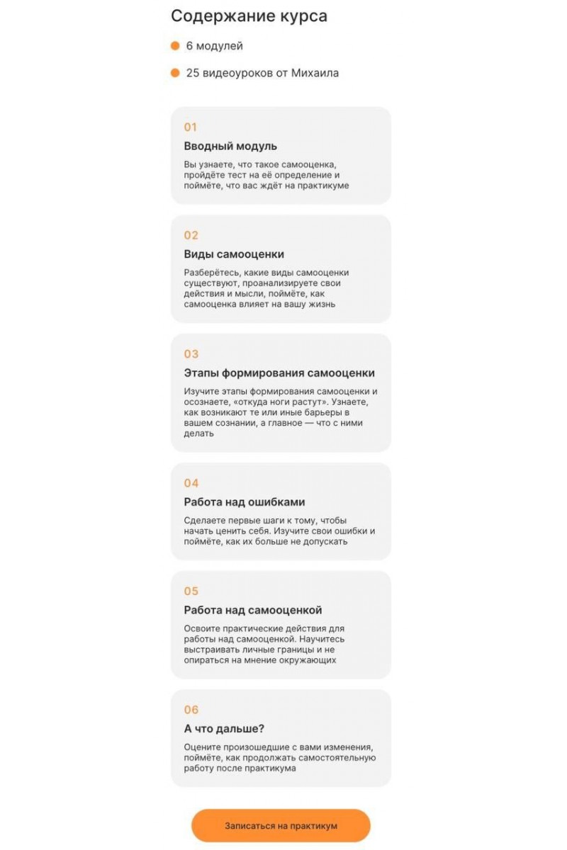 Для тех, кто хочет обрести веренность и здоровую самооценкуСодержание курса1 Вводный модульВы узнаете, что такое самооценка, пройдёте тест на её определение и поймёте, что вас ждёт на практикуме2 Виды самооценкиРазберётесь, какие виды самооценки существуют, проанализируете свои дейтствия и мысли, поймёте, как самооценка влияет на вашу жизнь3 Этапы формирования самооценкиИзучите этапы формирования самооценки и осознаете, «откуда ноги растут». Узнаете, как возникают те или иные барьеры в вашем сознании, а главное — что с ними делать4 Работа над ошибкамиСделаете первые шаги к тому, чтобы начать ценить себя. Изучите свои ошибки и поймёте, как их больше не допускать5 Работа над самооценкойОсвоите практические действия для работы над самооценкой. Научитесь выстраивать личные границы и не опираться на мнение окружающих6 А что дальше?Оцените произошедшие с вами изменения, поймёте, как продолжать самостоятельную работу после практикумаАвтор Михаил Лабковский.Самый узнаваемый психолог России*Автор 6 правил счастливой жизни, которые помогли миллионам людей обрести счастье и уверенностьАвтор бестселлеров «Хочу и буду», «Люблю и понимаю»Консультирующий психолог с 40-летним стажемФормат:6 модулей 25 видеоуроков