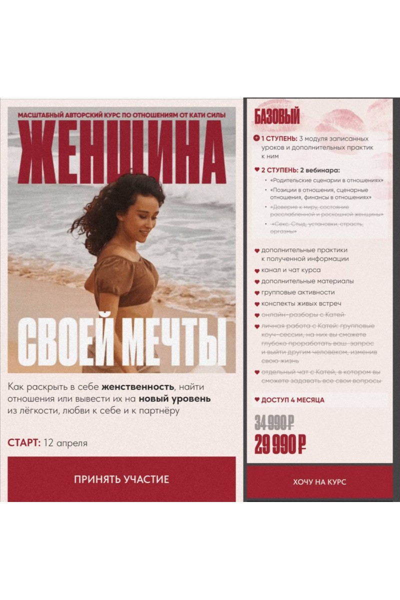 ЕСЛИ ТЫ СВОБОДНАкурс позволит тебе проанализировать, почему у тебя не получается построить отношения, увидеть свои сценарии, которые могут этому мешать, начать доверять и открываться мужчинамиЕСЛИ ТЫ В ОТНОШЕНИЯХкурс поможет тебе провести глубокий анализ отношений, понять свои позиции в них и занять правильное место, еще больше углубить вашу связь или понять, какой человек должен быть рядом с тобойПрограмма:3 модуля записанных уроков и дополнительных материалов:ПРО ТЕБЯ:- Самооценка- Твоя ценность и чего ты достойна- Типы привязанностиПРО НЕГО:- Зависимость- Абьюз- Мужская психология. Мифы и правдаПРО ВАС:- Манипуляции- Конфликты- Языки лювби- Техники сближения- Партнер/ты теряет интерес- Недостатки партнера и что с этим делать- Стадии отношений и как их проходить